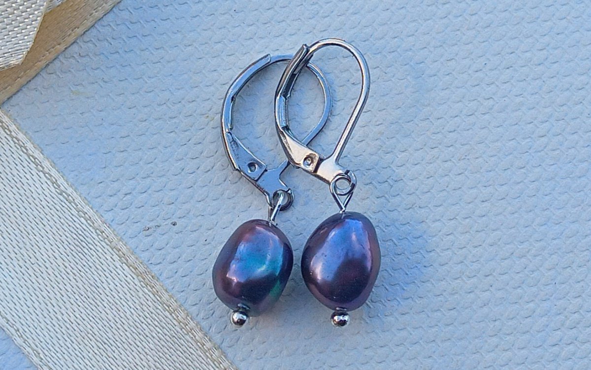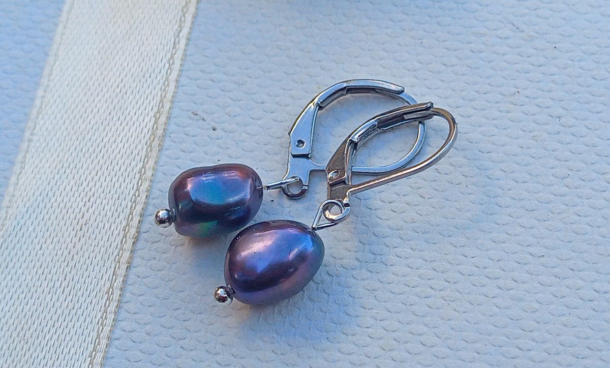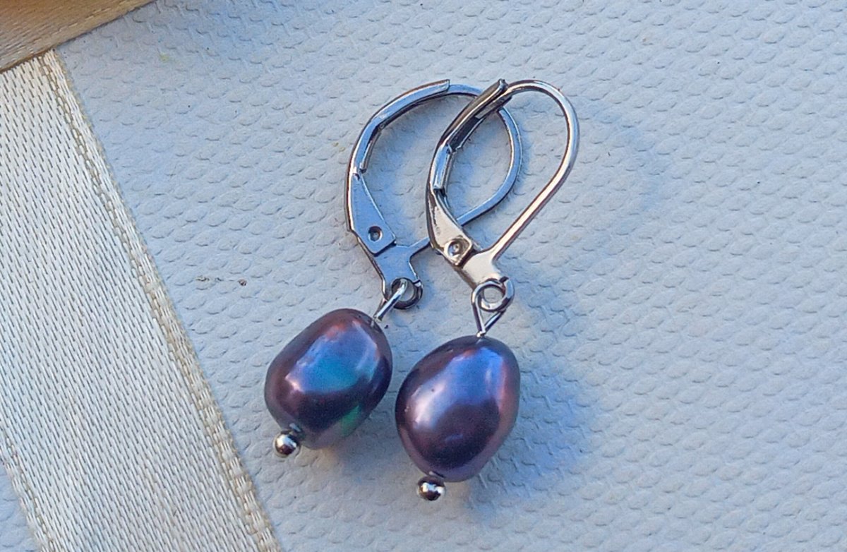 Dokonale lesklé tmavě modré až antracitové říční perly velké cca 10 mm s nádhernými duhovými perleťovými odlesky v elegantních náušnicích na zavíracích háčcích z chirurgické oceli - hypoalergenní, vhodné i pro alergiky.