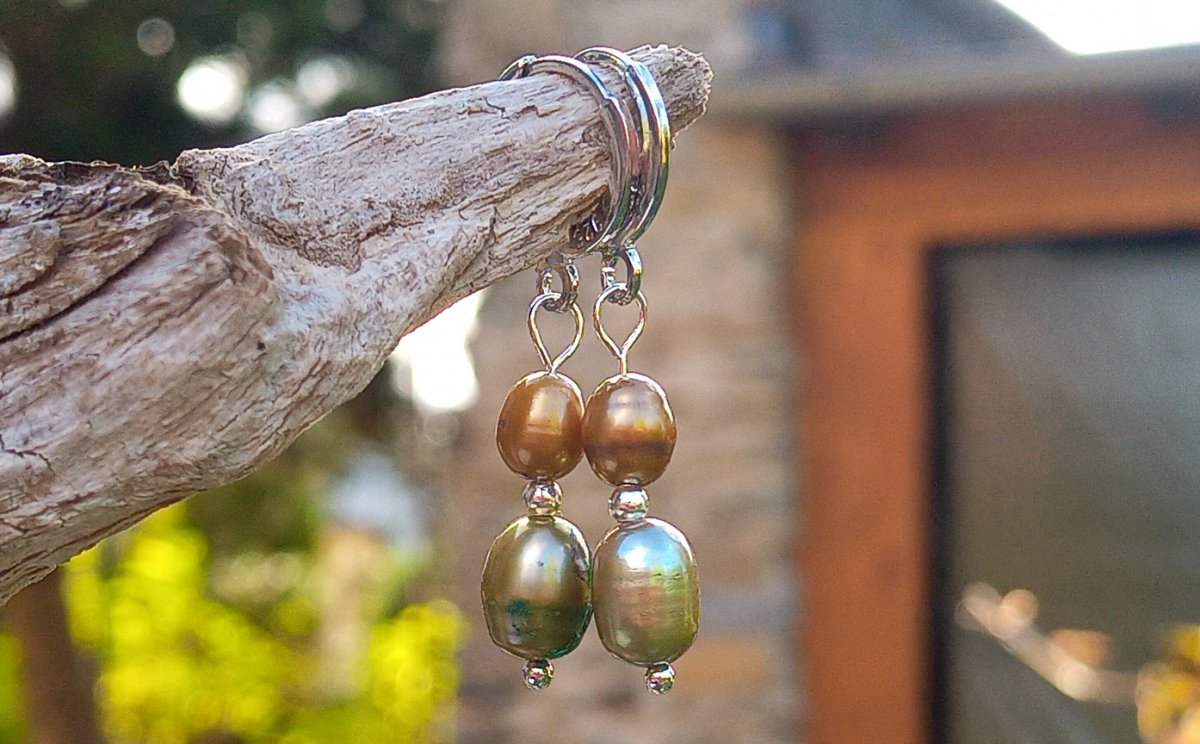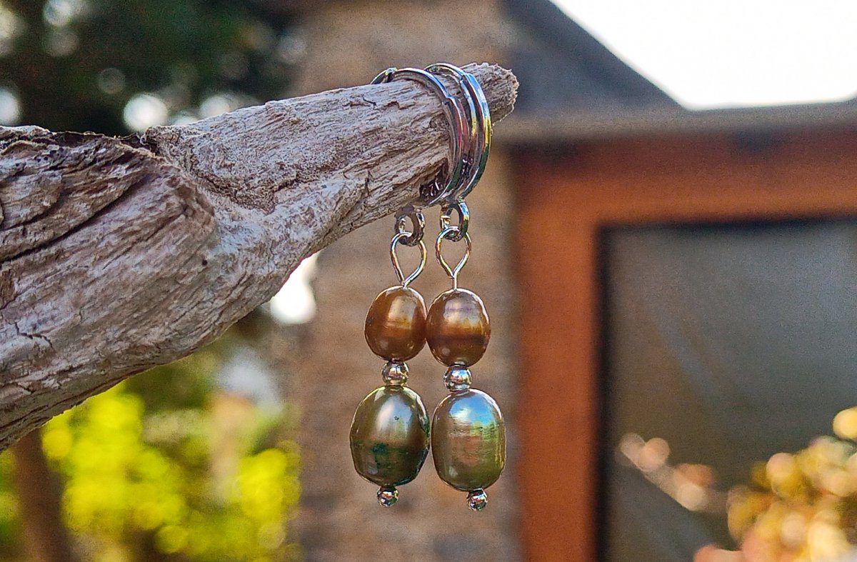 Náušnice z dokonale lesklých hnědých a zelených říčních perel o velikosti cca 9 a 6 mm na postříbřených zavíracích háčcích.