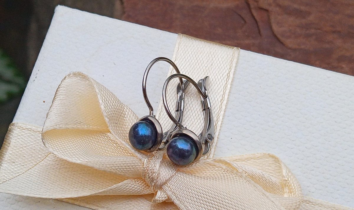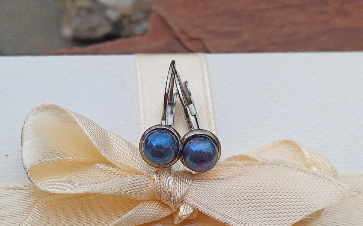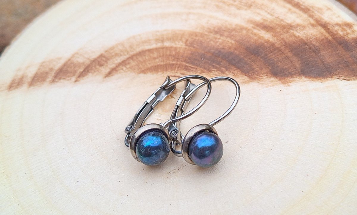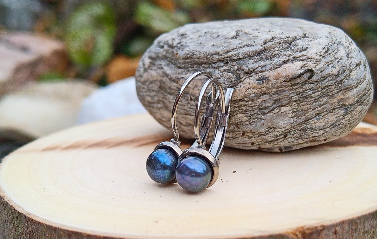 Elegantní náušnice s dokonale lesklými říčními tmavě modrými perlami o průměru 6 mm s krásnými duhovými perleťovými odlesky vloženými do zavíracích háčků z leštěné chirurgické oceli - hypoalergenní, vhodné i pro alergiky. Perly jsou v top kvalitě!
