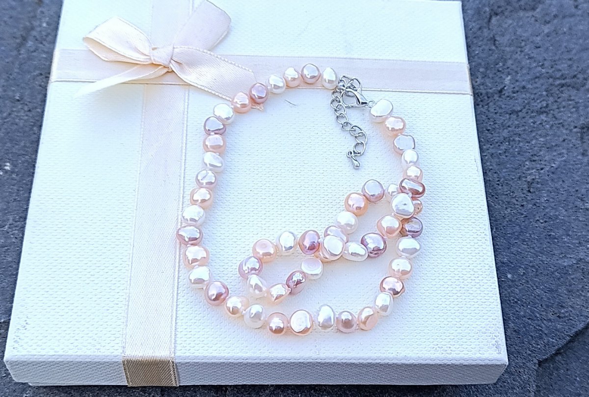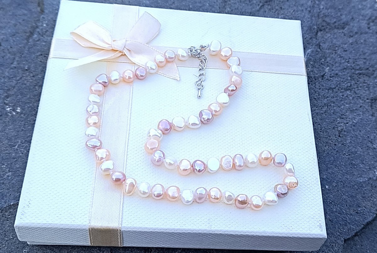 Jednotlivé perličky jsou od sebe oddělené uzlíky proti vzájemnému odírání. Perly nejsou přibarvované, mají přírodní barvy v jemných odstínech - bílá, fialková a růžová, které se pravidelně střídají. Perly vynikají dokonalým leskem s duhovými perleťovými odlesky.