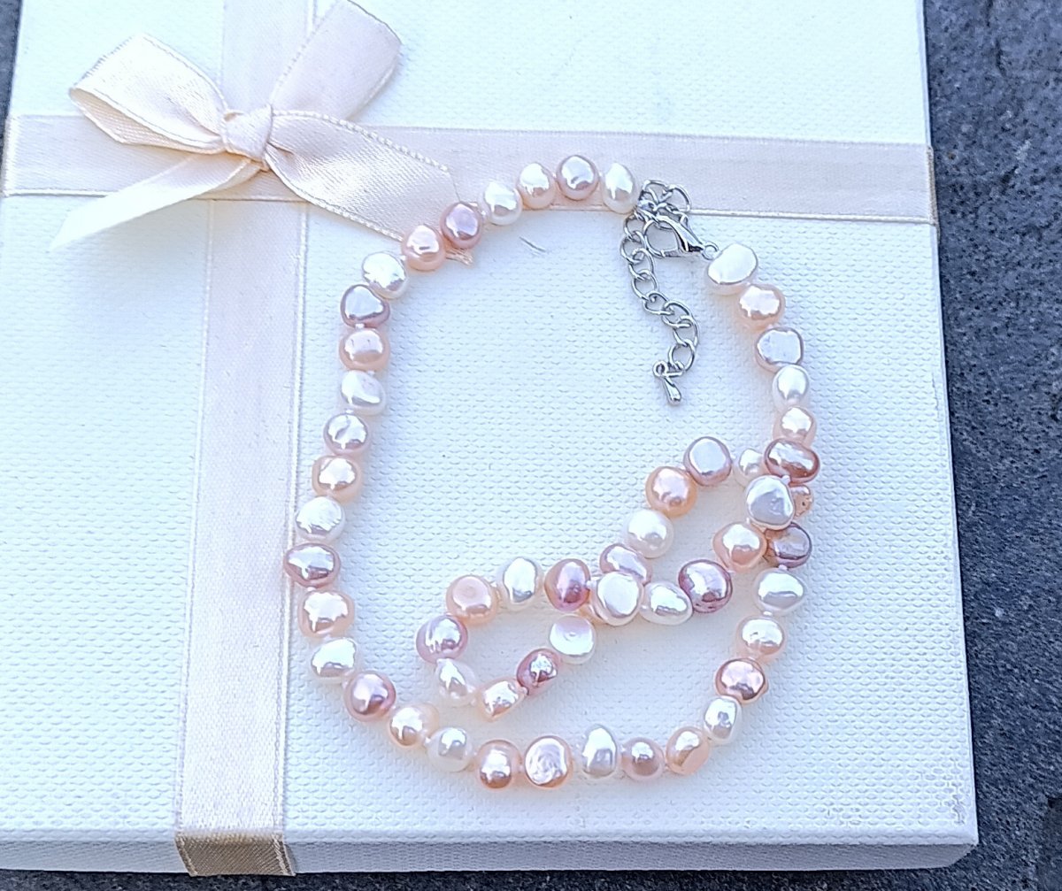 Říční dokonale lesklé perličky o velikosti cca 7 mm v uzlíkovaném něžném náhrdelníku se zapínáním na karabinku a s prodlužovacím řetízkem.