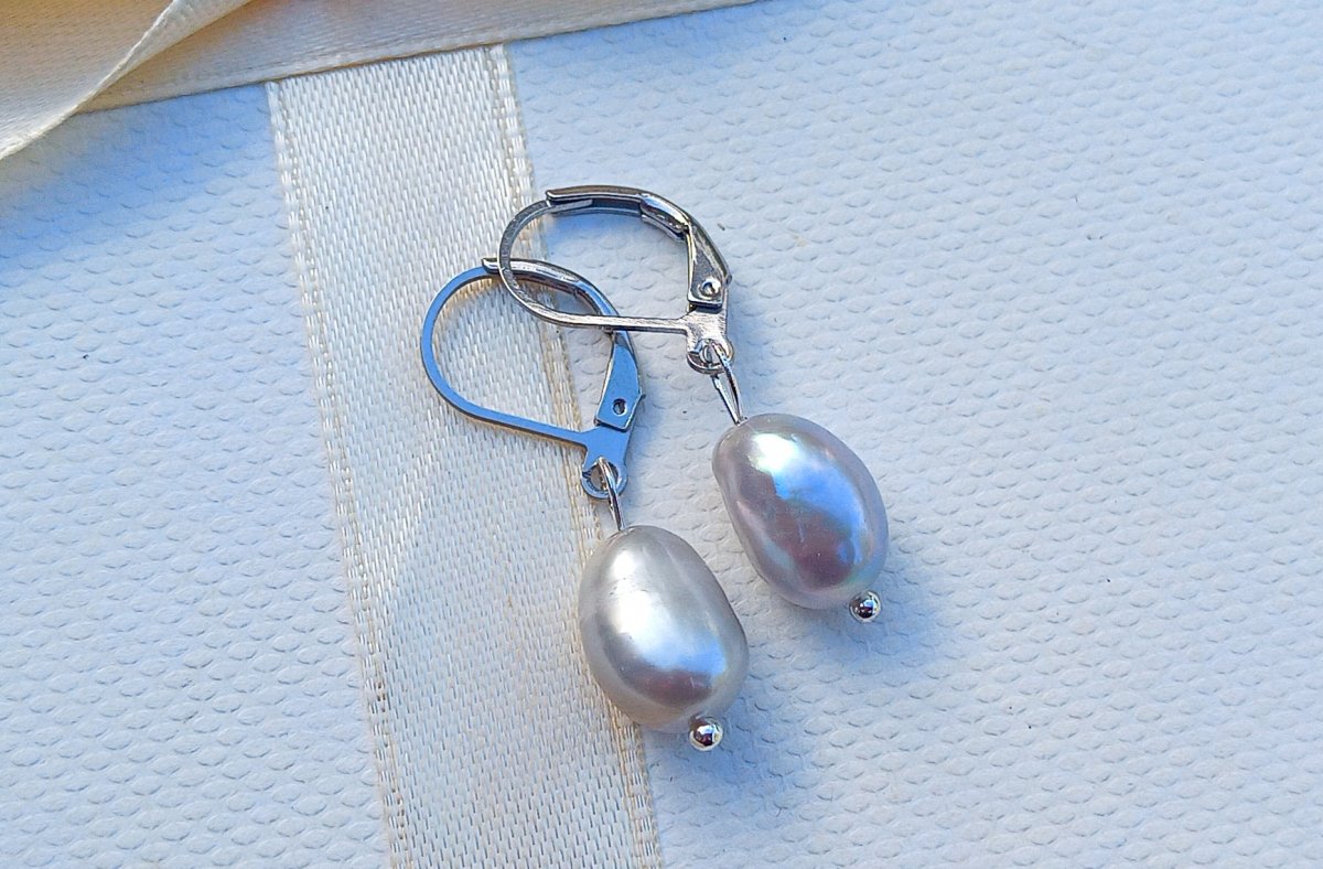 Dokonale lesklé šedé říční perly velké cca 12 mm v elegantních náušnicích dlouhých 3,4 cm na zavíracích háčcích z chirurgické oceli - hypoalergenní, vhodné i pro alergiky.