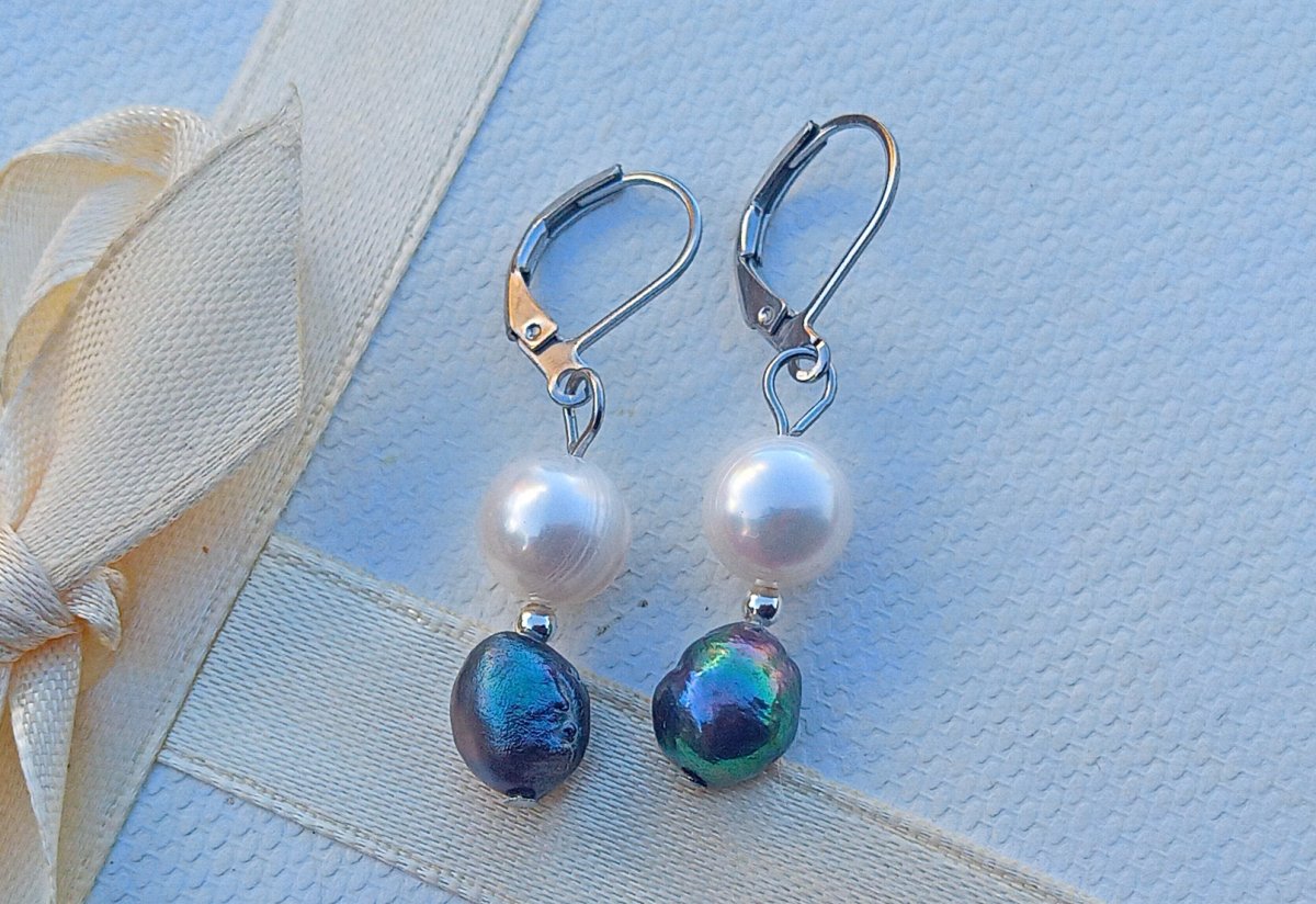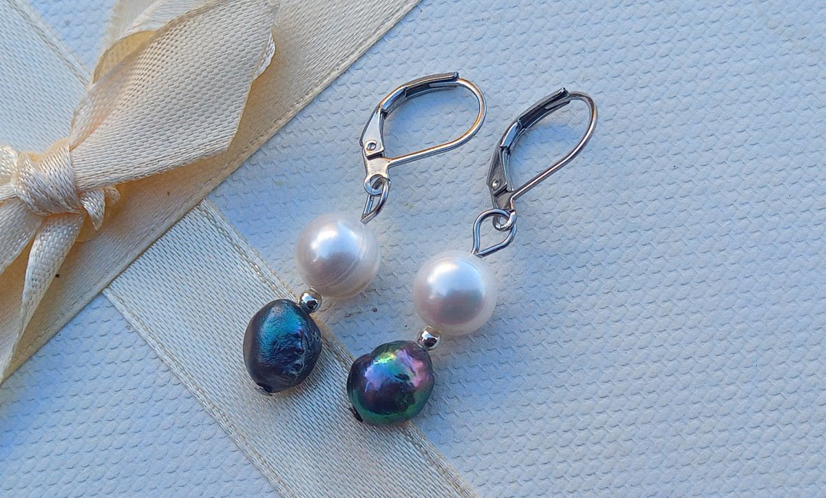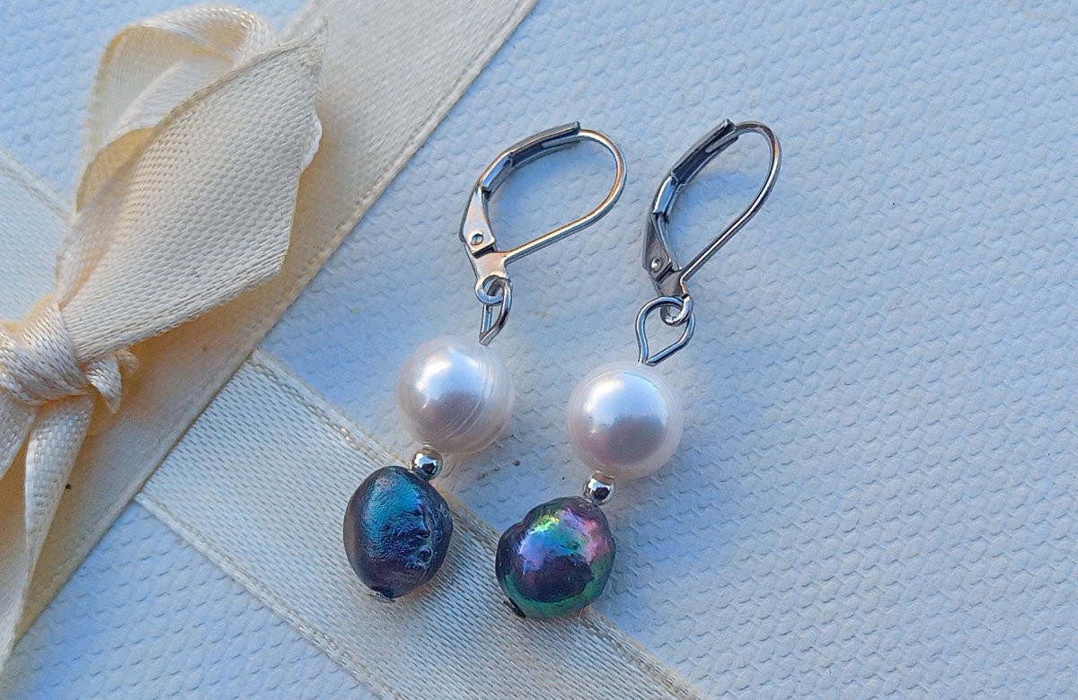 Náušnice z dokonale lesklých říčních perel o velikosti cca 10 a 8 mm v bílé a tmavě modré barvě oddělených od sebe drobným stříbrným korálkem na zavíracích háčcích z chirurgické oceli - hypoalergenní, vhodné i pro alergiky.