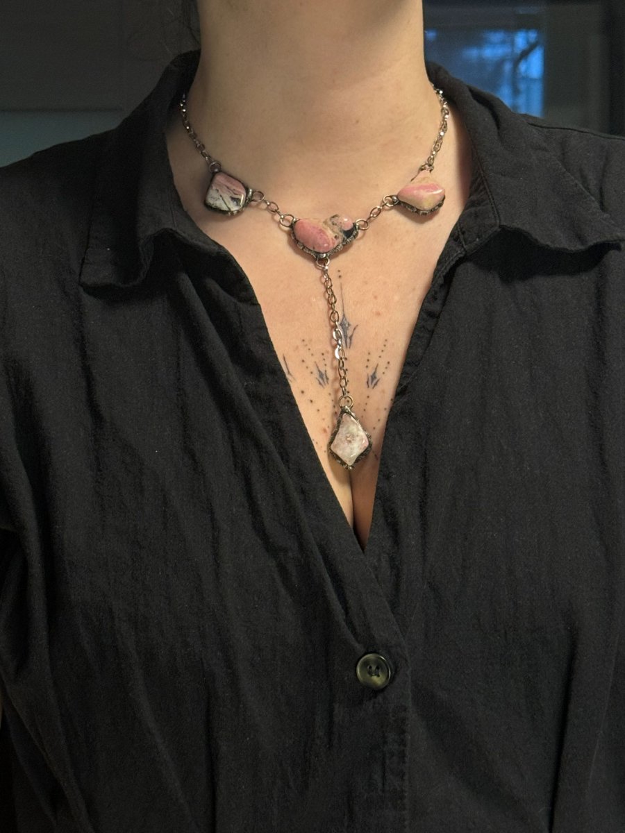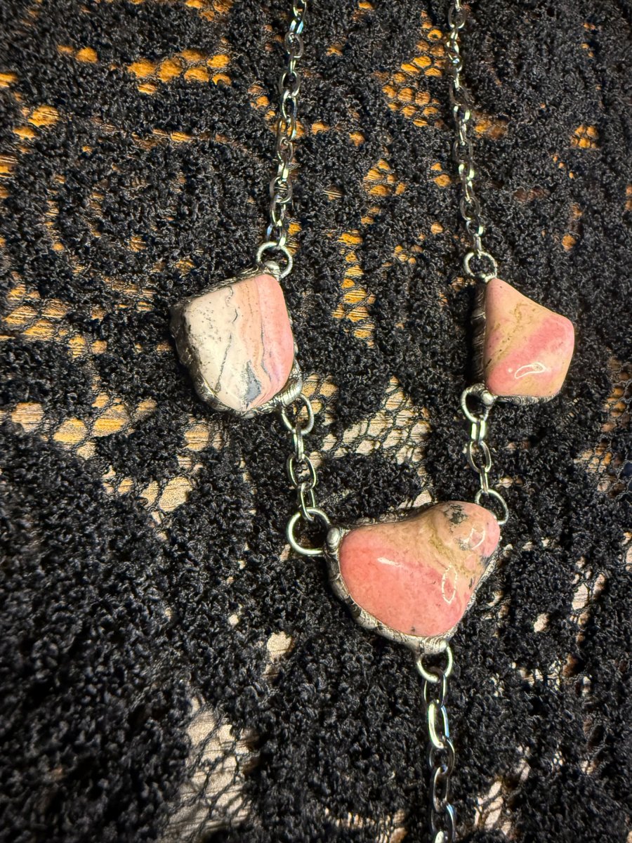 Dlouhý náhrdelník se čtyřmi kameny rodonitu.