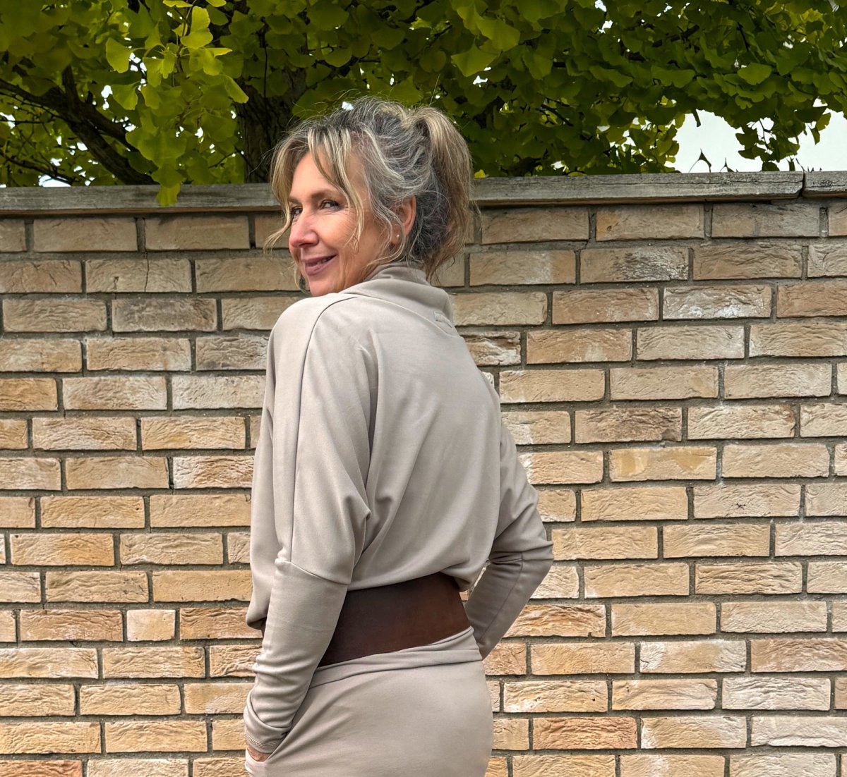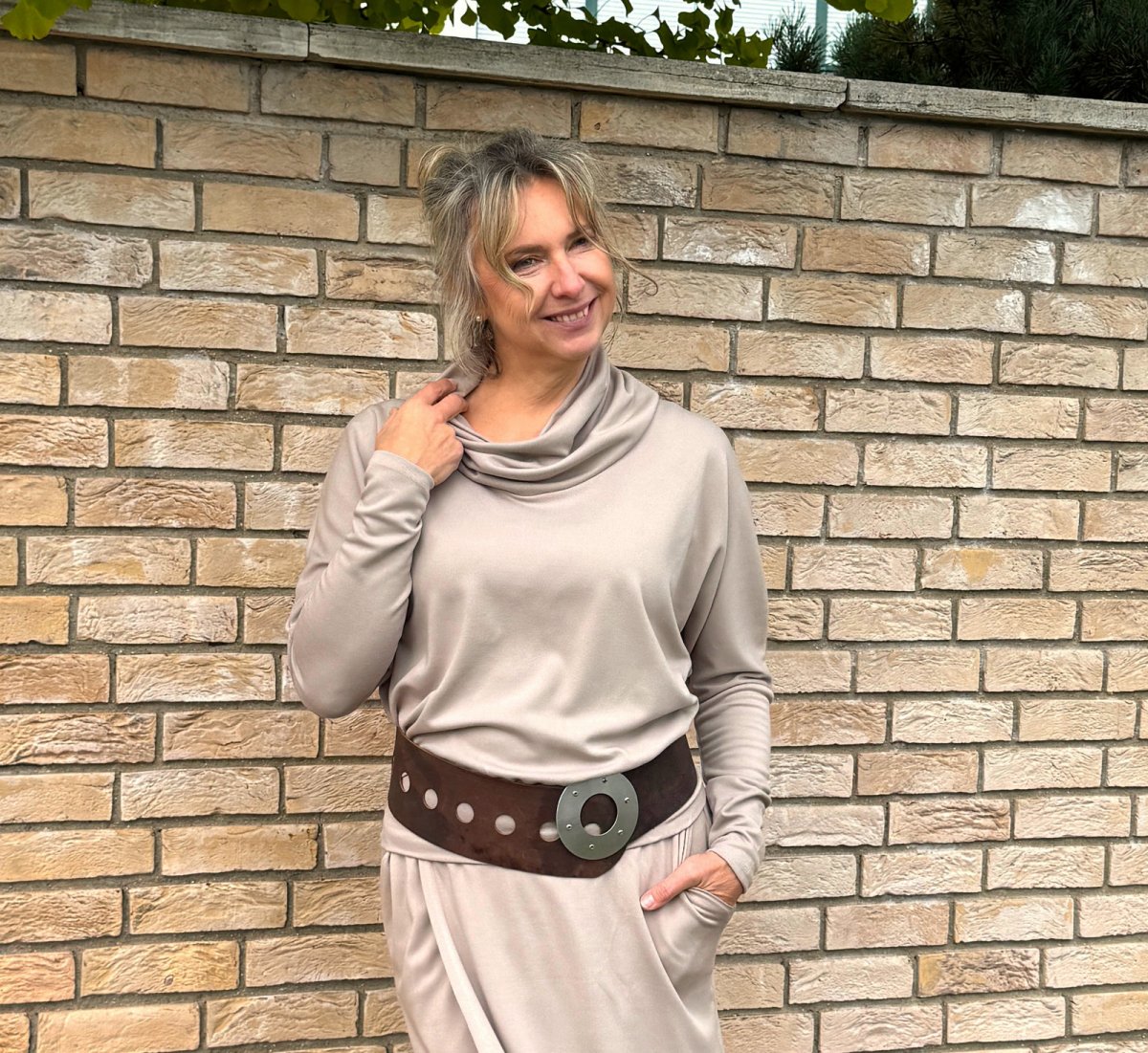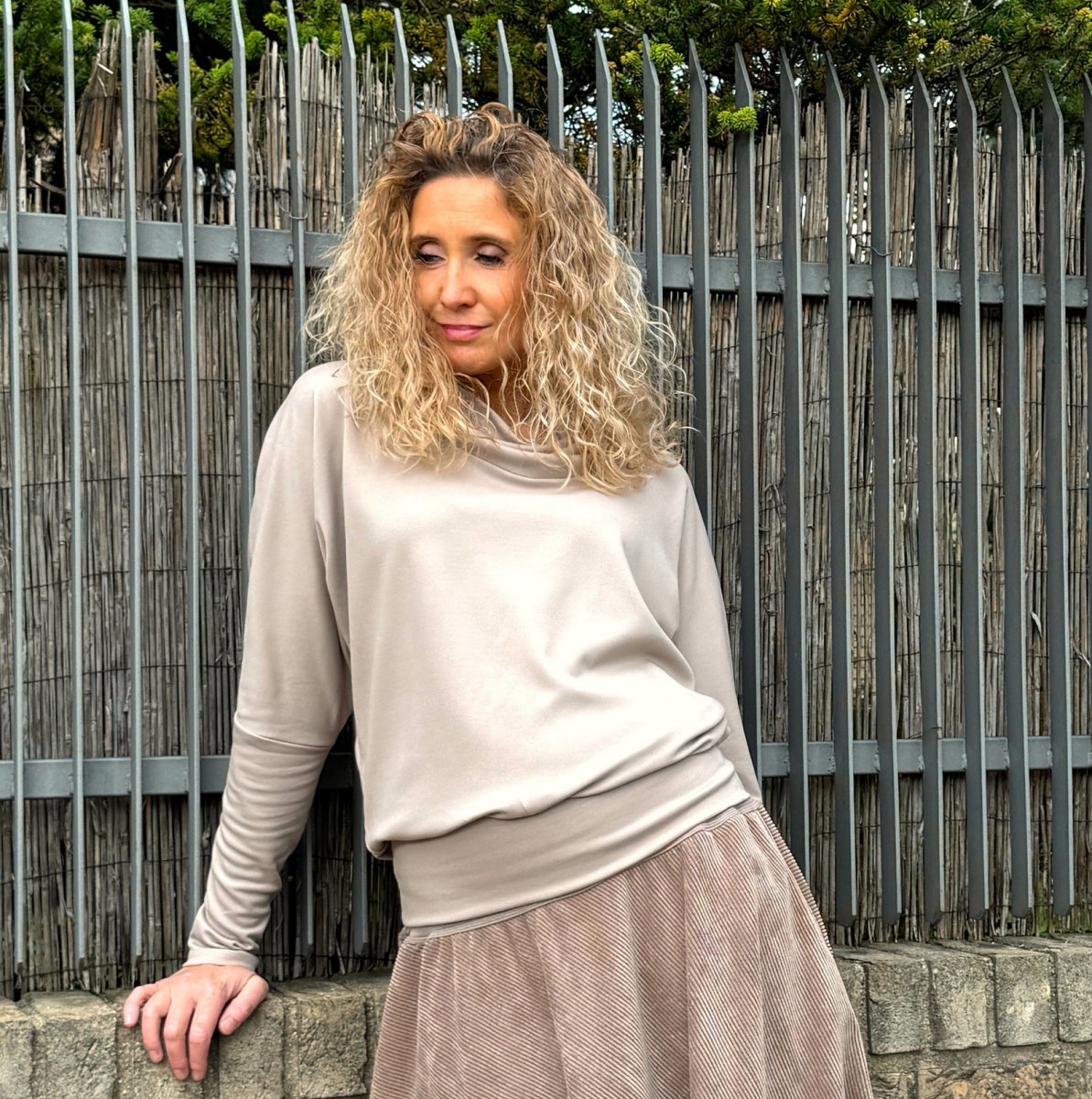 Rolák s dlouhým netopýřím rukávem je ušitý ze středně silného směsového úpletu (68%vis/28%Pes/4%ela). Spodní díl je stažený do širokého pružného lemu.