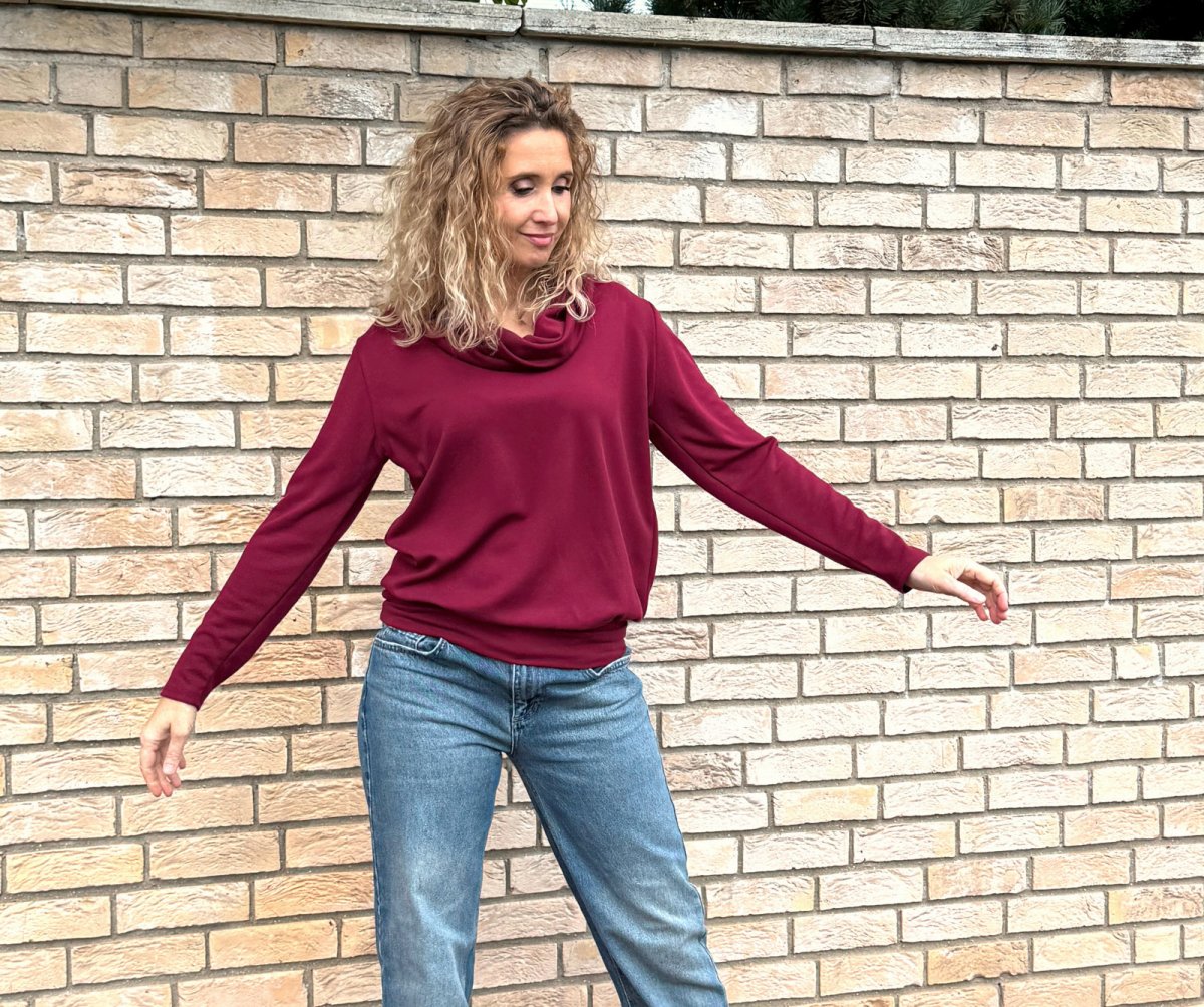 Rolák s dlouhým rukávem je ušitý ze středně silného směsového úpletu (68%vis/28%Pes/4%ela). Spodní díl je stažený do širokého pružného pasu.