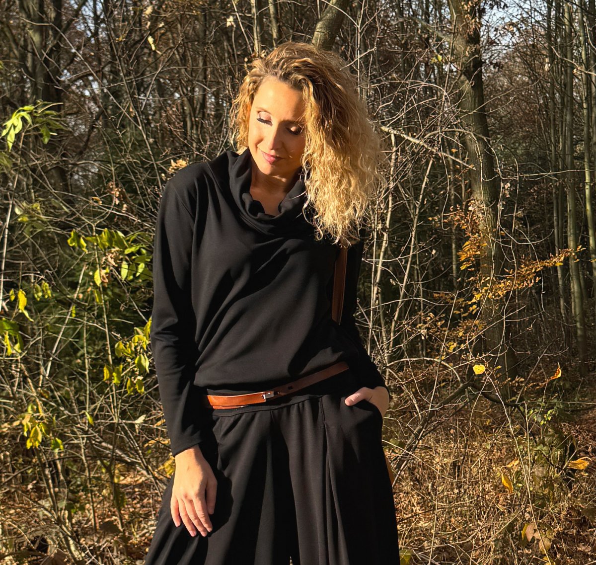 Rolák s dlouhým rukávem je ušitý ze středně silného směsového úpletu (68%vis/28%Pes/4%ela). Spodní díl je stažený do širokého pružného pasu.