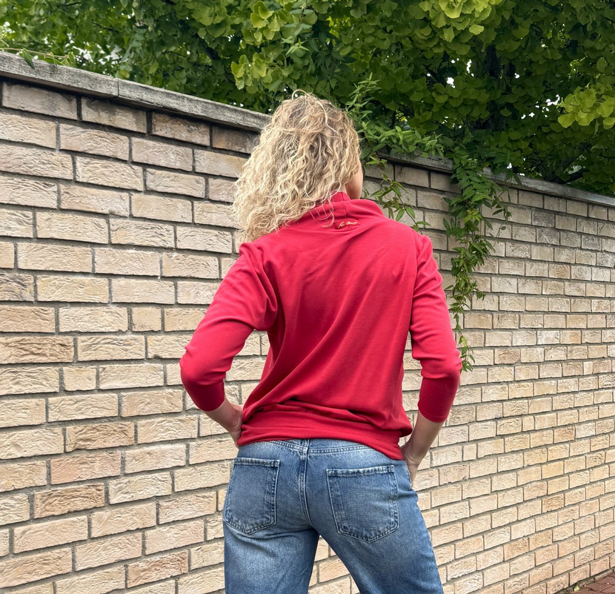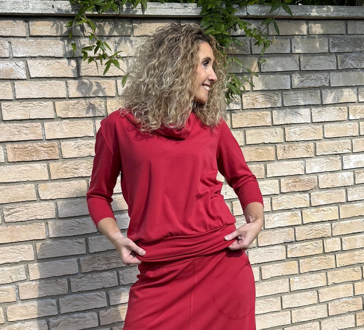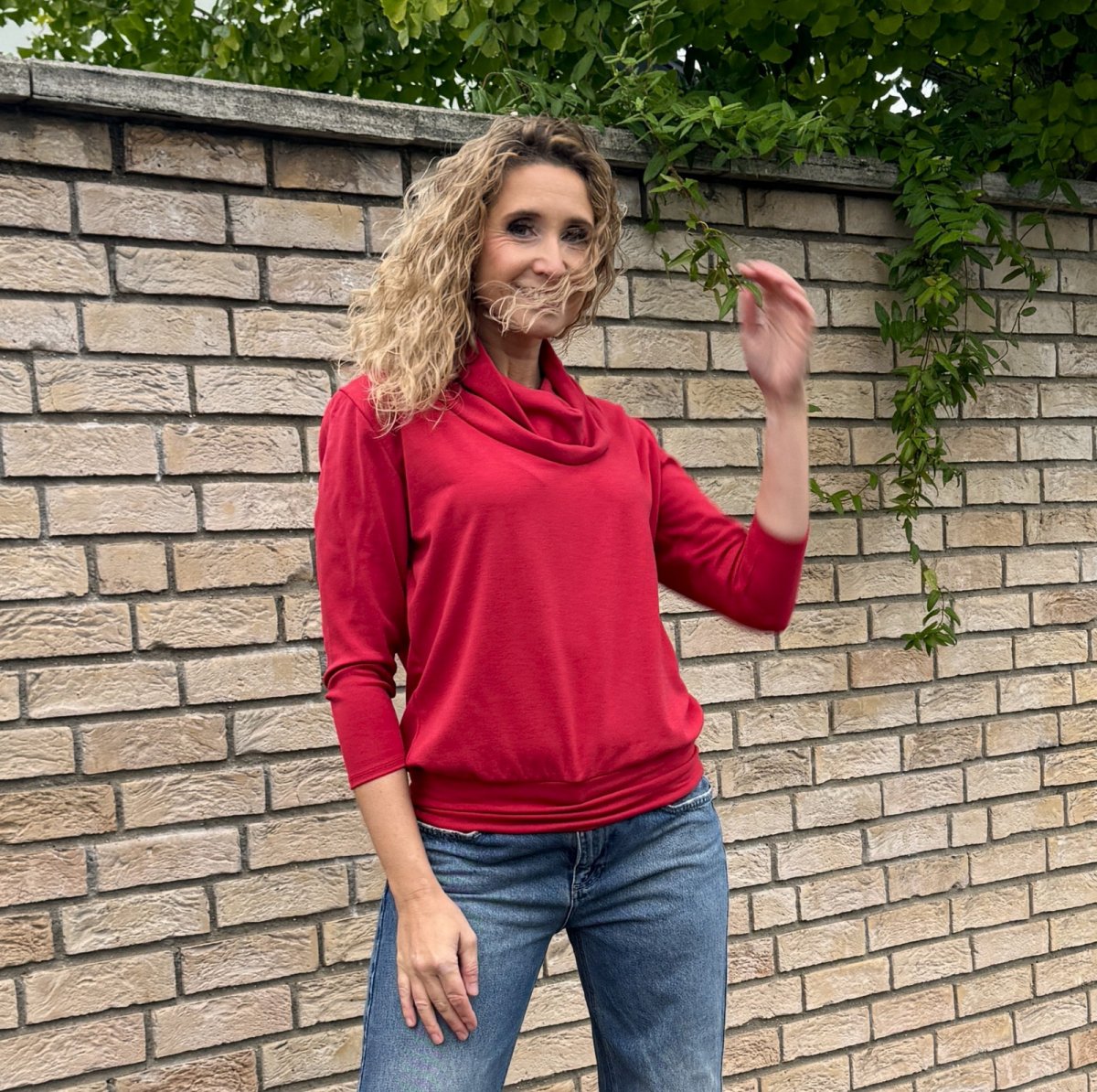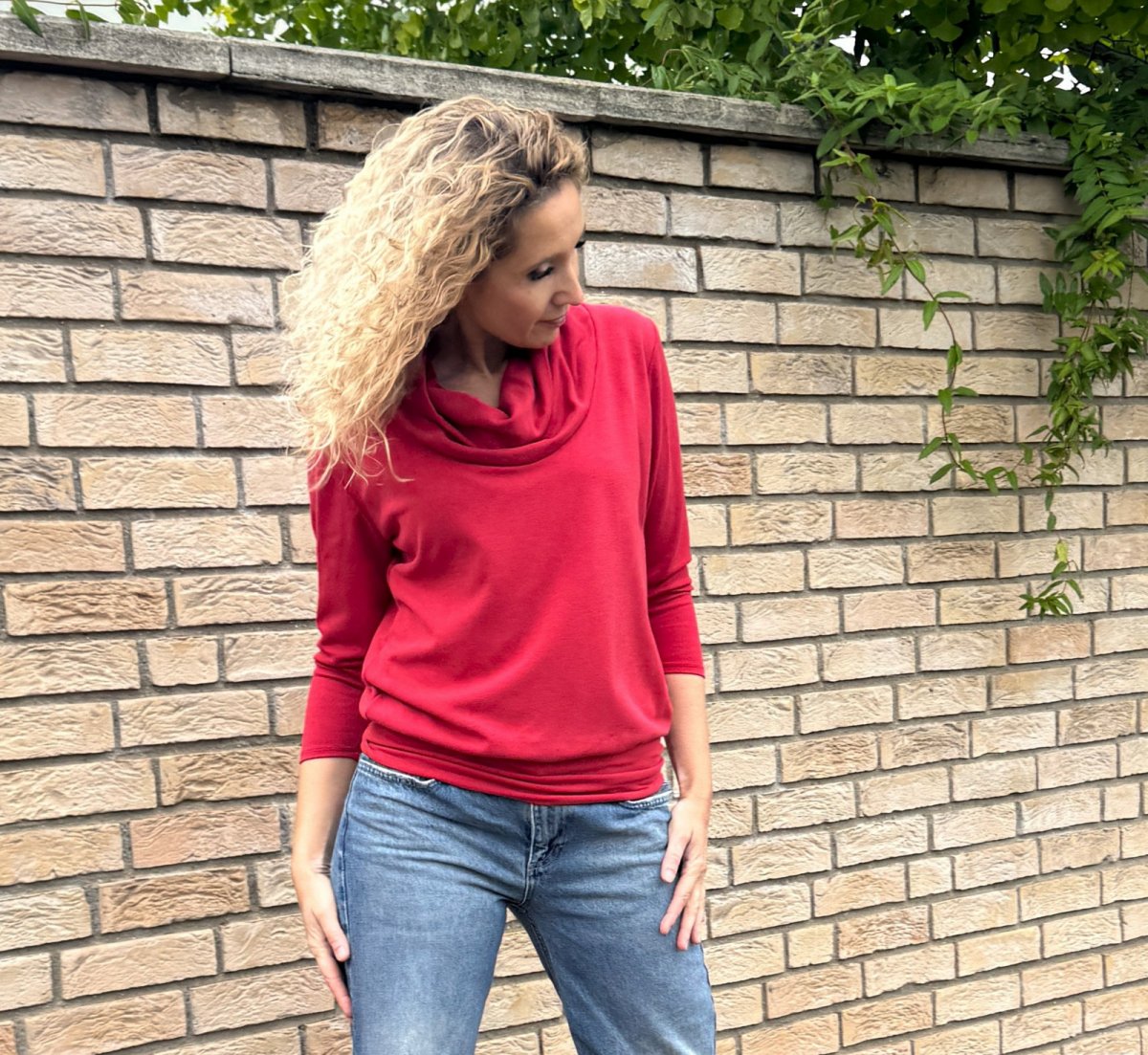 Rolák s 3/4 rukávem je ušitý ze středně silného směsového úpletu (68%vis/28%Pes/4%ela). V pase je stažený do širokého lemu.