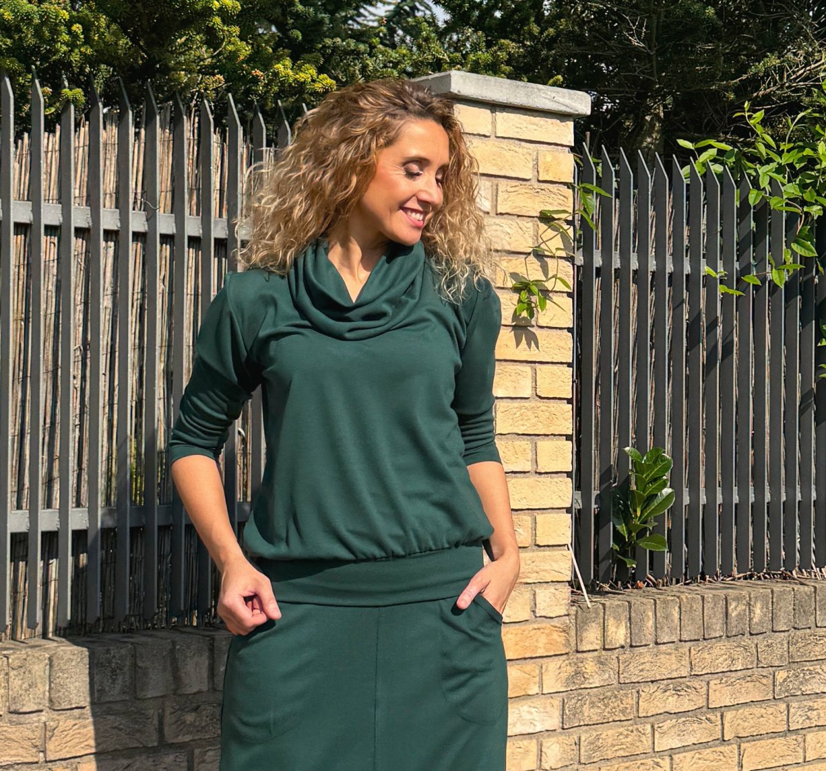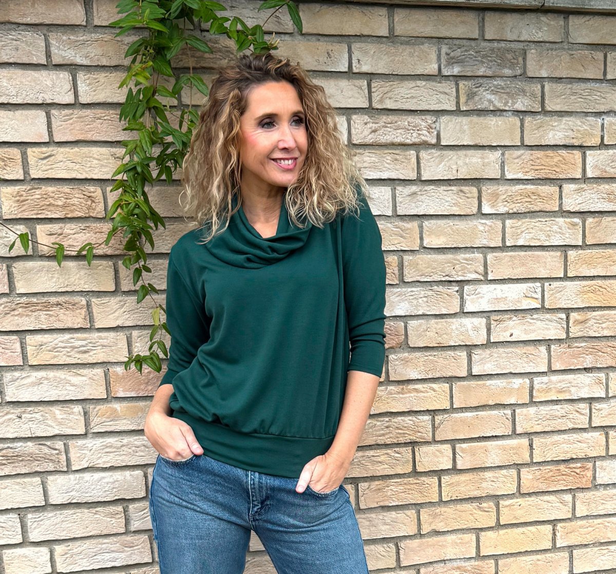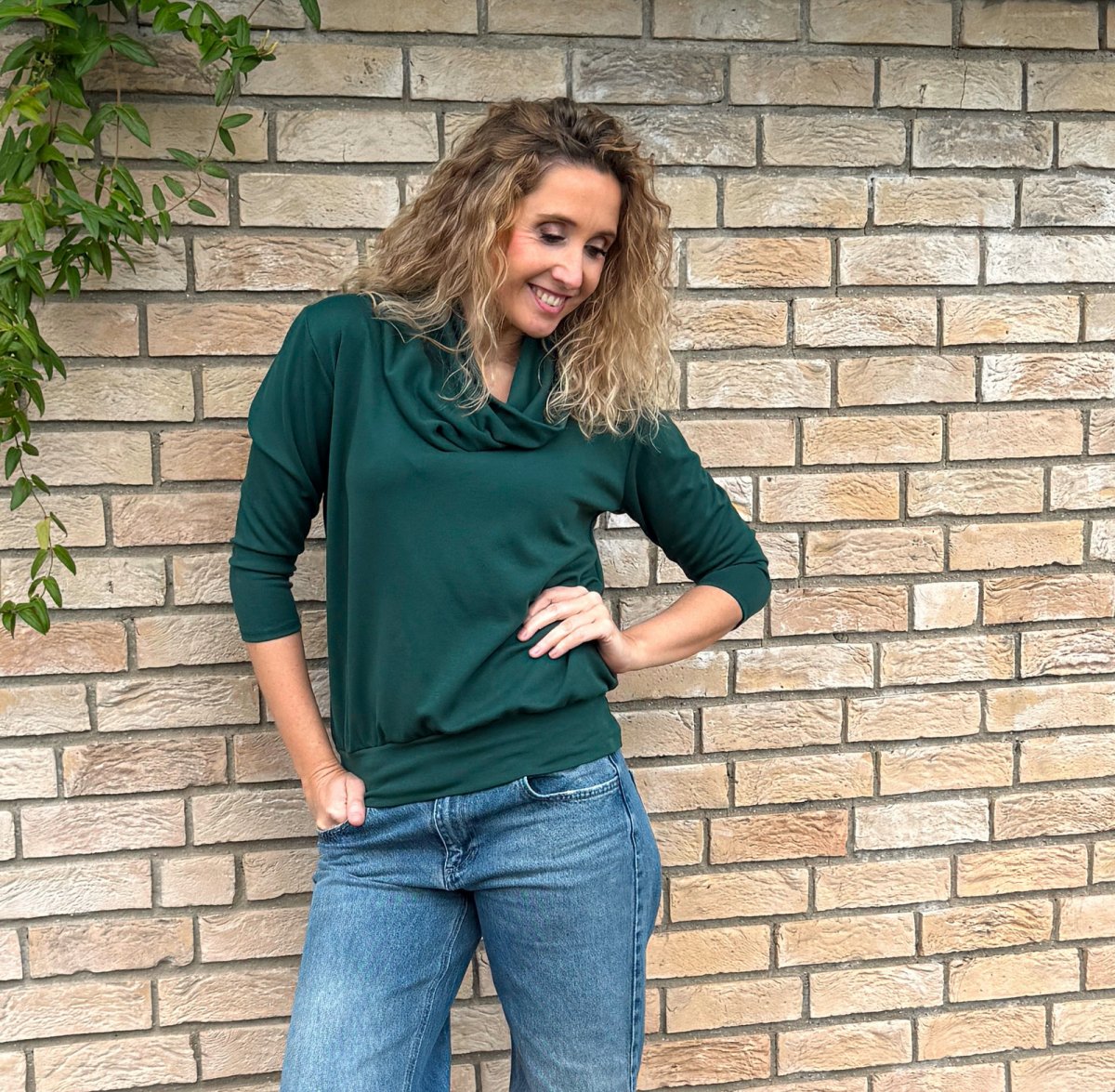 Rolák s 3/4 rukávem je ušitý ze středně silného směsového úpletu (68%vis/28%Pes/4%ela). V pase je stažený do širokého lemu.