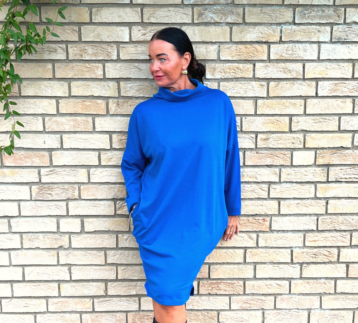 Šaty mají balonový střih a dlouhé rukávy. V bočních švech jsou kapsy.