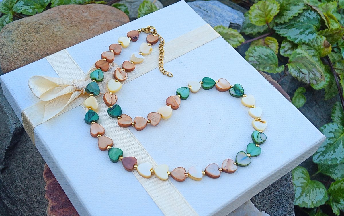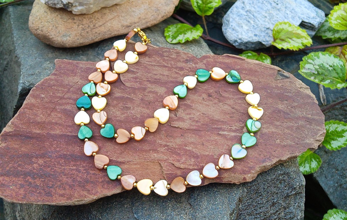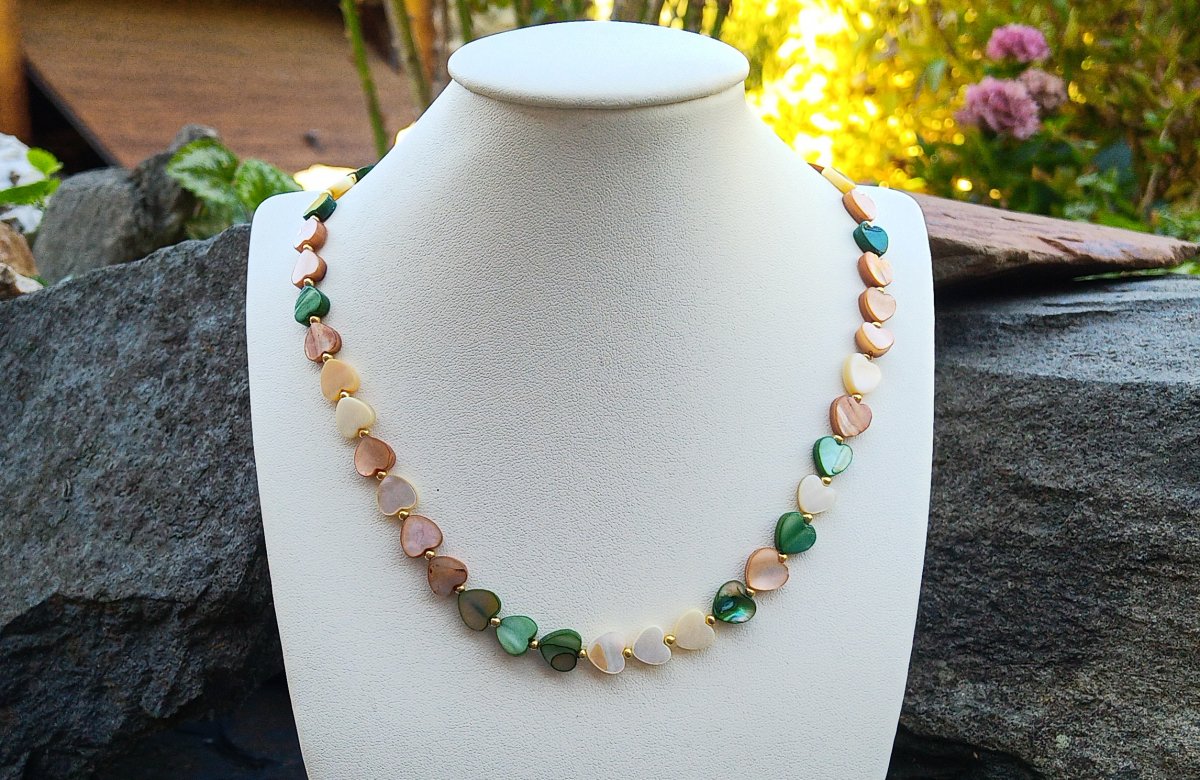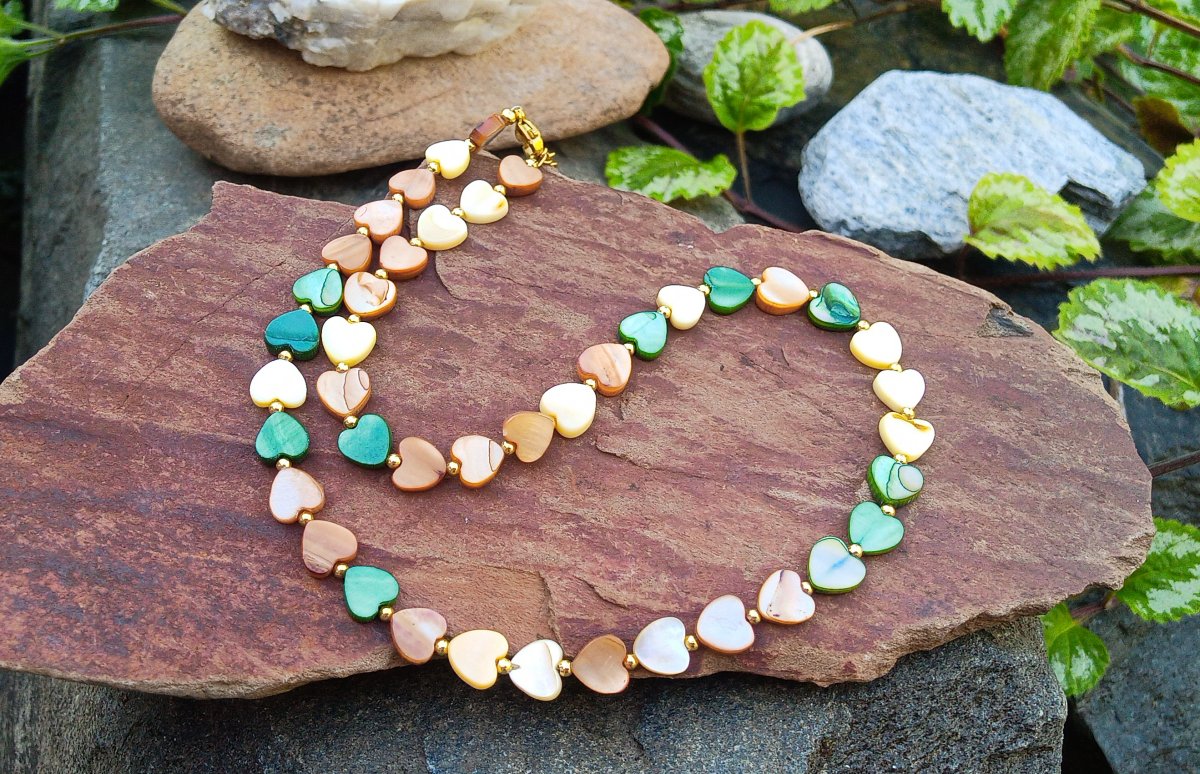 Romantický náhrdelník vyrobený z přírodní barevné dokonale lesklé perletě ve tvaru srdíček prokládaných pozlacenými korálky doplněný o prodlužovací řetízek. Perleť vyniká krásným nádherným leskem s duhovými perleťovými odlesky.