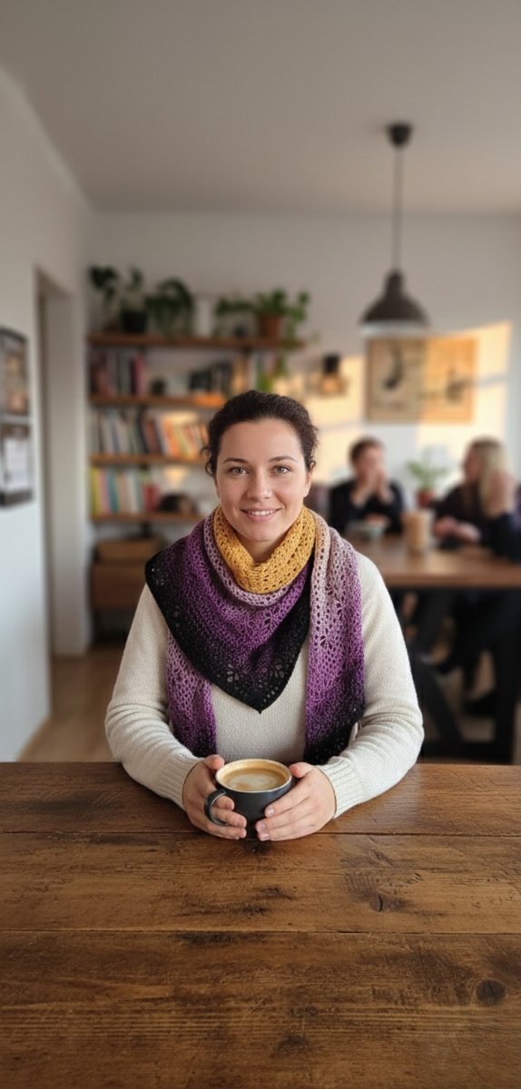 Šátek vyniká unikátním barevným přechodem od hřejivé hořčicové až po elegantní temně fialovou. Je vyroben z jemné příze, která je velmi příjemná na dotek, neškrábe a krásně splývá. Díky své velikosti a trojúhelníkovému střihu ho můžete nosit na mnoho způsobů – jako elegantní pléd přes ramena nebo jako bohatý nákrčník, který vás zahřeje i v tom největším mrazu.