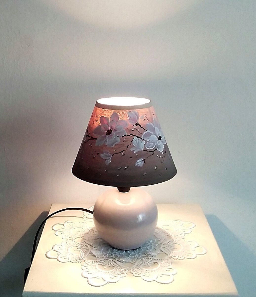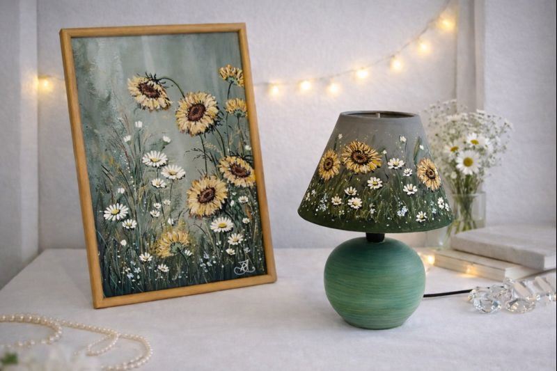 Tato ručně malovaná stolní lampička představuje elegantní spojení umění a funkčního designu. Stínidlo zdobí ručně malovaný květ v jemných pastelových tónech, který dodává lampičce luxusní a umělecký vzhled. Stabilní podstavec v ladícím modrém odstínu vytváří harmonický celek, který se hodí do moderních i klasických interiérů.