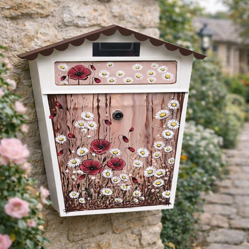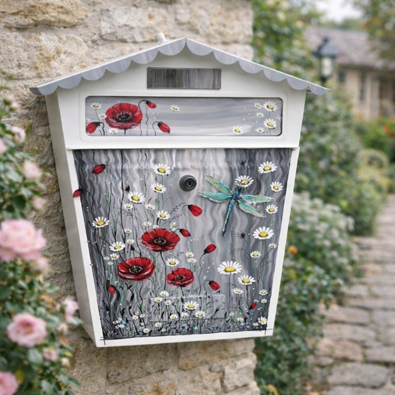 Originální ručně malovaná poštovní schránka s květinovým motivem červených máků a bílých kopretin promění vstup do domu v příjemné a osobité místo. Jemná kombinace šedých tónů, výrazných červených květů a bílých detailů působí svěže, romanticky a přirozeně zapadne do venkovního prostředí.