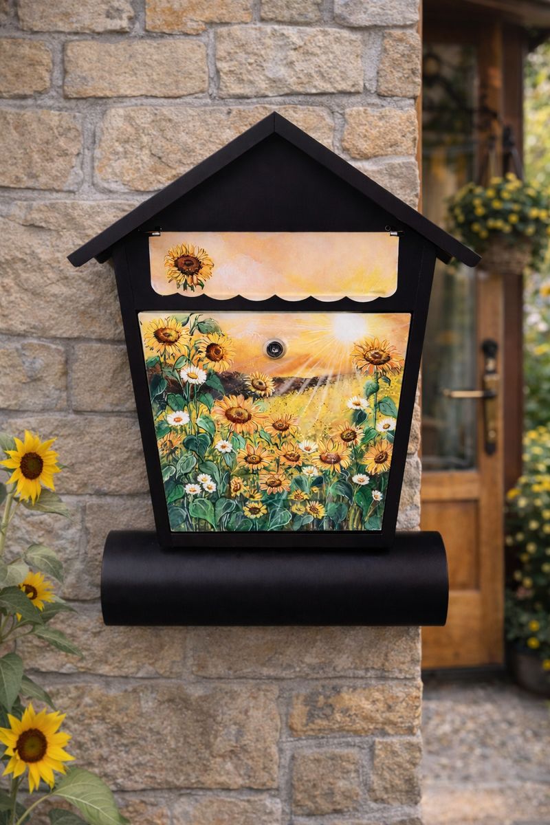 Tato ručně malovaná poštovní schránka ve tvaru domečku je výrazným a zároveň elegantním doplňkem fasády domu. Autorský motiv slunečnic, vlčích máků a kopretin je laděn do jemných přírodních tónů, které krásně kontrastují s černým rámem schránky a vyniknou na světlé i tmavší omítce.