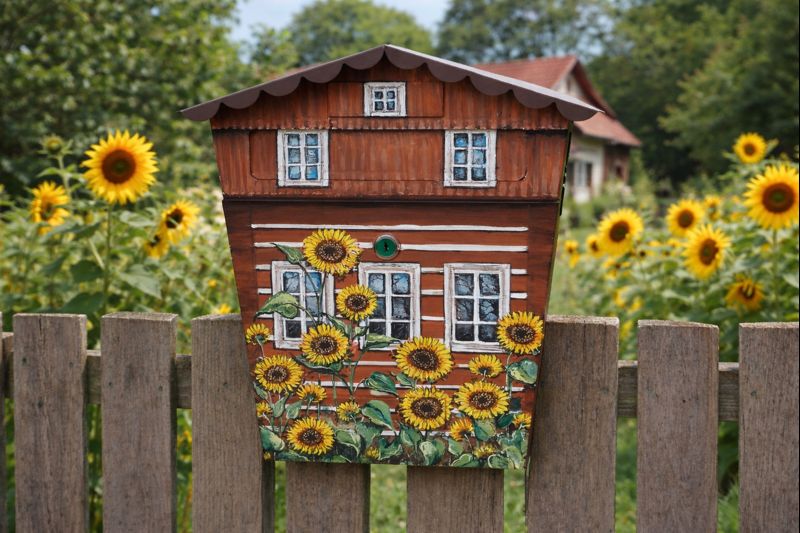 Každý detail je pečlivě propracovaný – od oken s květinami až po tmavý podklad připravený pro vlastní číslo popisné. Schránka krásně vynikne na plotě, zdi i u vchodu do domu a skvěle zapadne do zahradního i venkovského prostředí.