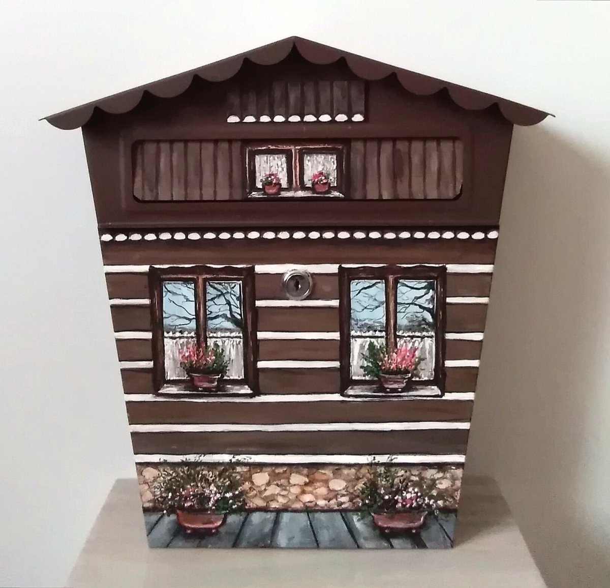 Originální poštovní schránka inspirovaná tradičním venkovským domem je nejen praktickým doplňkem, ale i výraznou dekorací exteriéru. Ruční malba kombinuje architekturu chalupy s jemnými květinovými a přírodními prvky, které vytvářejí hřejivou a útulnou atmosféru už při příchodu ke vstupu domu.
