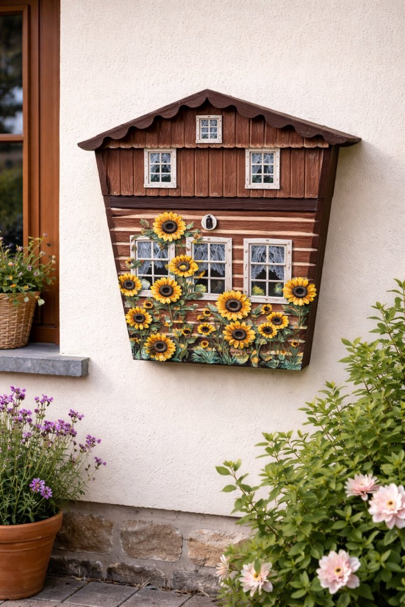 Slunečnice symbolizují radost, světlo a pohodu – přesně ty emoce, které tato dekorativní schránka vyvolává. V kombinaci s jemně laděným pozadím zahrady působí schránka přirozeně a harmonicky v jakémkoli exteriéru.