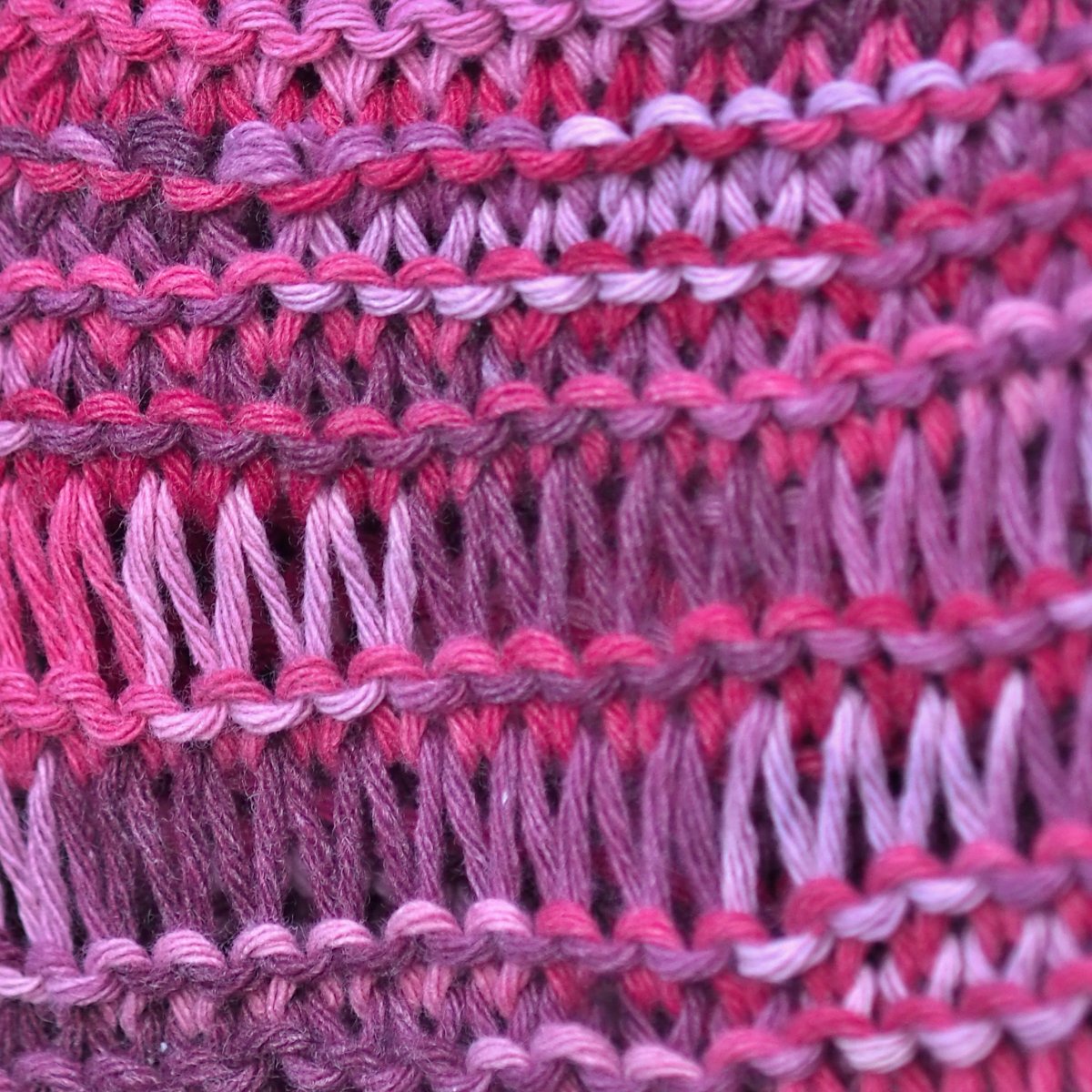 Barva - melírováná příze v odstínech purpurové,lila,světlé růžové,fuchciové.