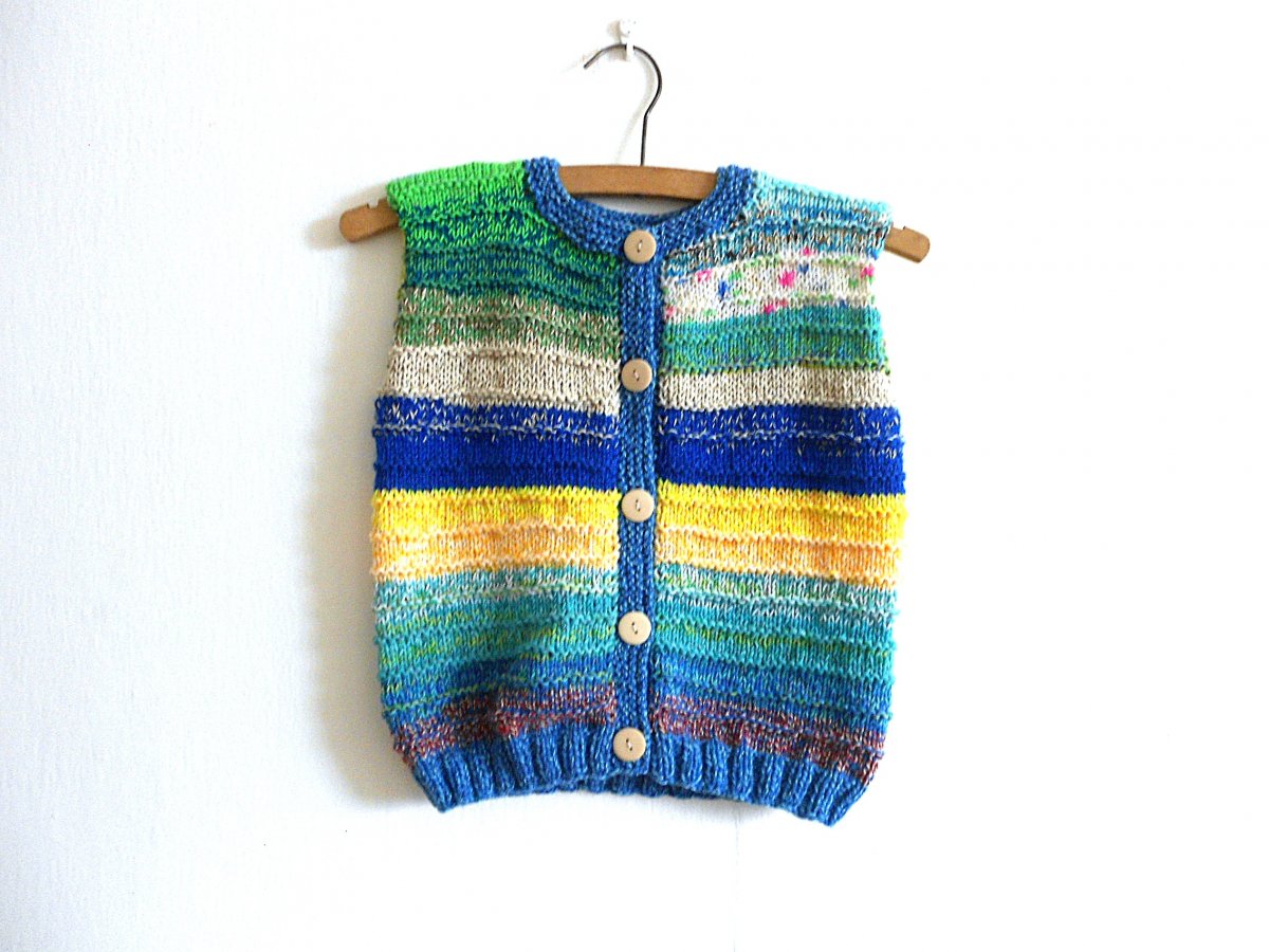 Kojenecká ručně pletená vestička, velikosti 104-110, délka 40cm, šířka 39 cm. Materiál: 60% merino, 20% akryl, 10% vlna, 10% bavlna.