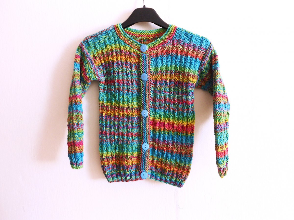 Ručně pletený, delší svetřík, velikosti 110-116, délka 46 cm, šířka 34 cm, vnitřní délka rukávu 34 cm. Materiál: 30% merino, 40% akryl, 30% vlna.