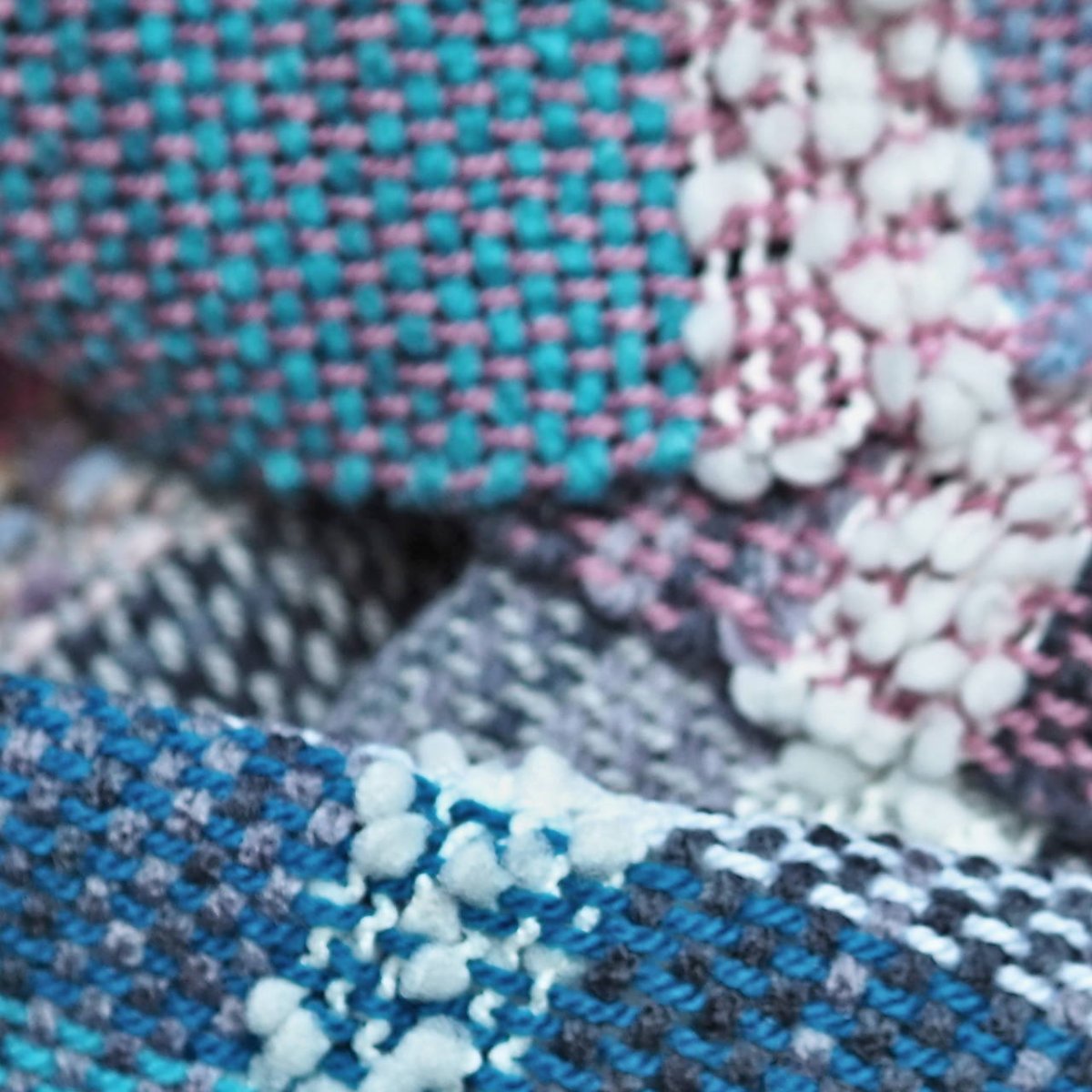 Útek - botatá textura s vícebarevným vzorem v barvě odstínu růžové,modré,tyrkysové,fialové,bílé,které jsou vytkané do nepravidelných bloků a přechodů,náhodně rozdělených efektně skanou přízí - viz.detailní foto.