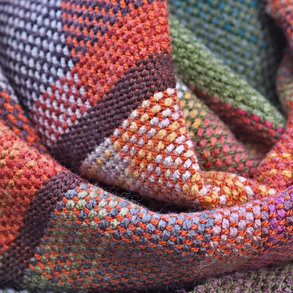 Útek - kombinace teplých odstínů zelené,oranžové,rezavé,hnědé,béžové,bordové - s náhodně vytkanými úzkými proužky v barvě temně hnědé - viz.detailní foto.