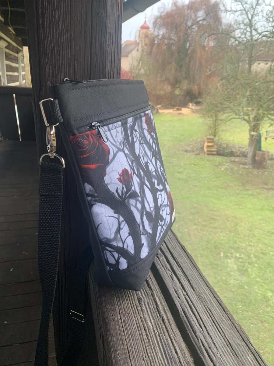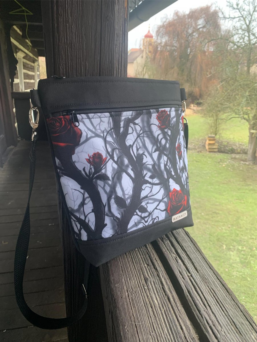 Crossby kabelka ušita z batohoviny černé a vzorované kočárkoviny, která je voděodolná.