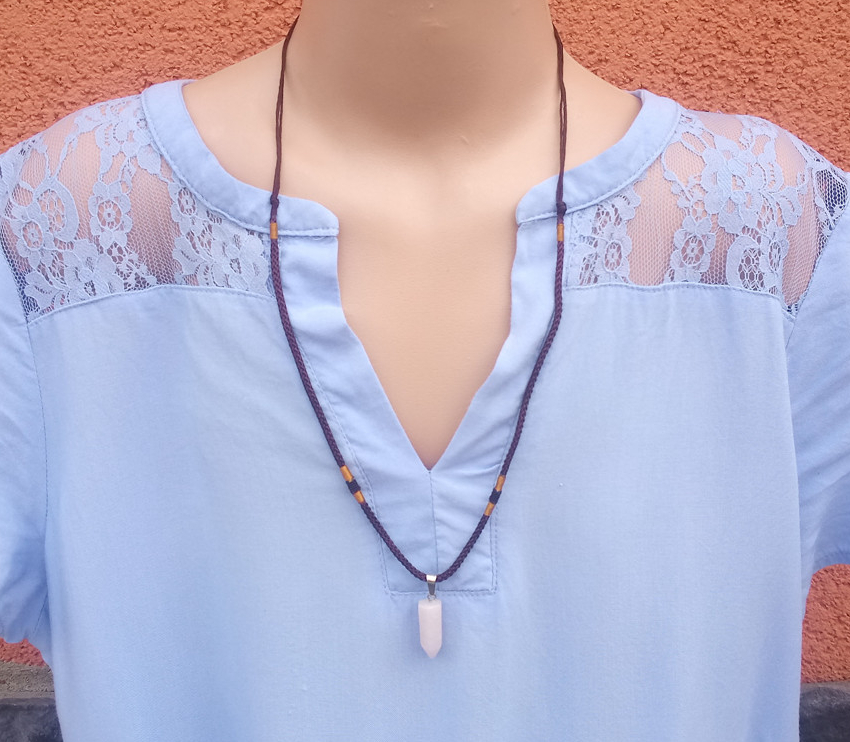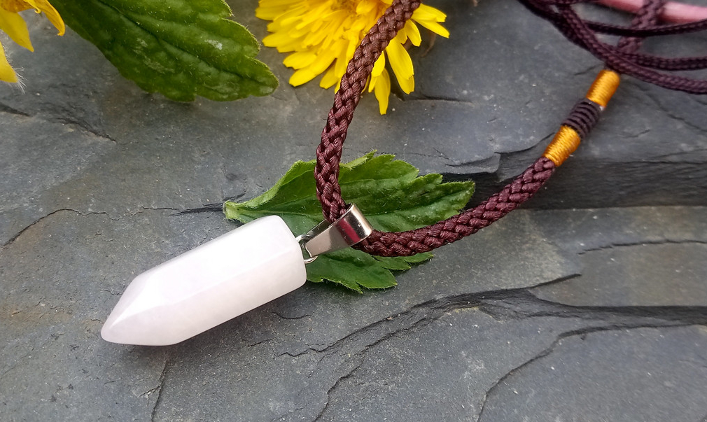 Broušený růženín kuželovitého tvaru se špičkou zavěšený na hnědém provázku s nastavitelnou délkou zdobený dvěma korálky růženínu o průměru 4 mm.