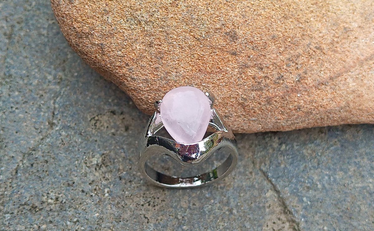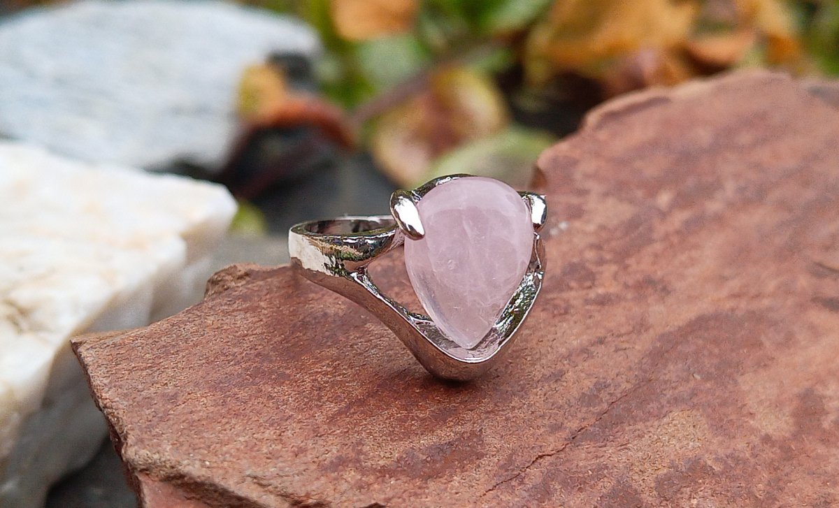Růženín ve tvaru kapky o velikosti cca 13x10 mm v elegantním postříbřeném prstýnku. Růženín je kámen lásky