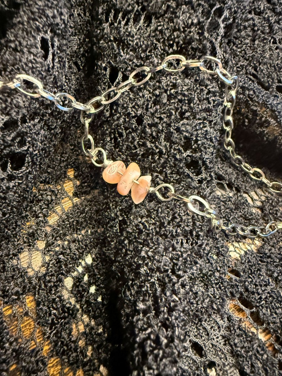 Dlouhý náhrdelník s Andským růžovým opálem. Do řetízku jsou vloženy malé kousky růženínu.
