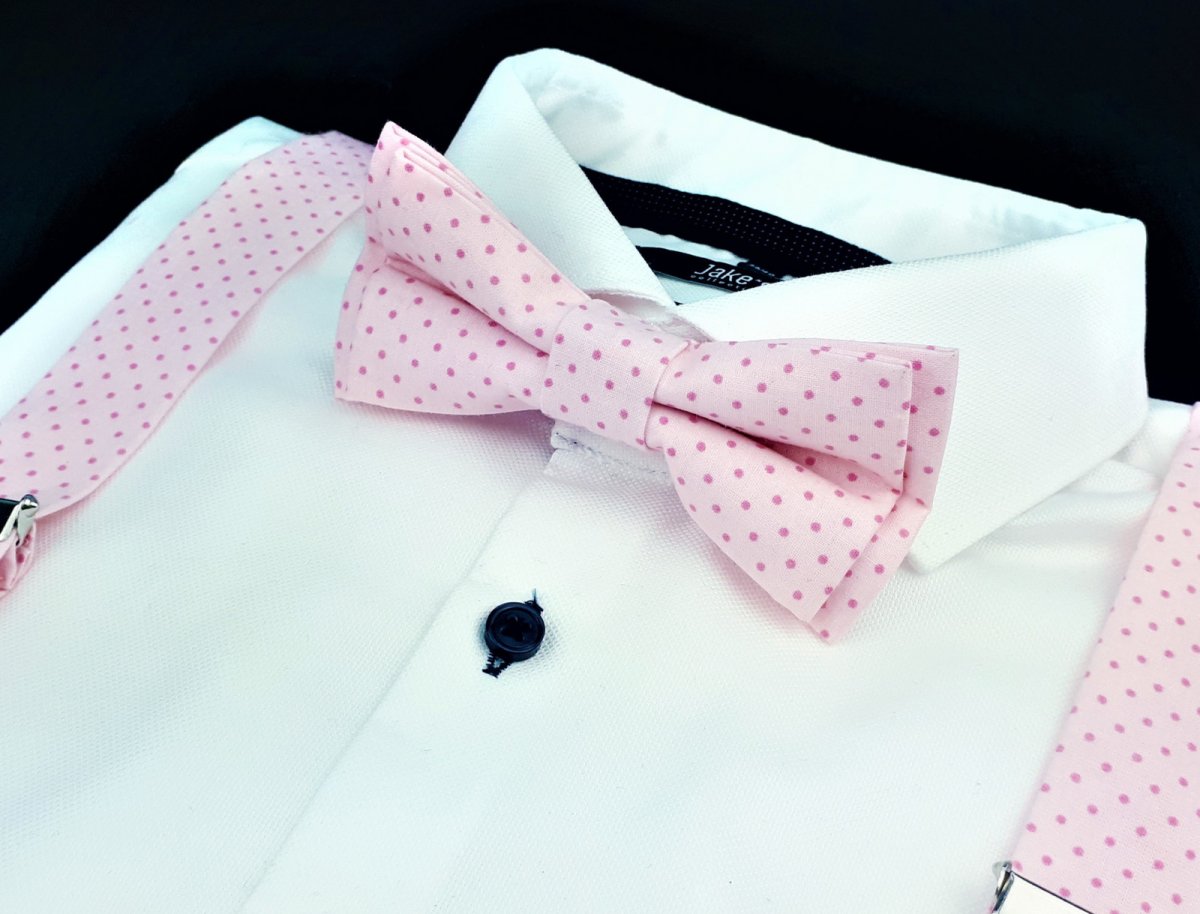 Elegantný pánsky motýlik, traky a vreckovka do saka v zelenej farbe s bielymi bodkami. Bol vyrobený pre tých, ktorí sa neboja priniesť nové farby do svojho štýlu.