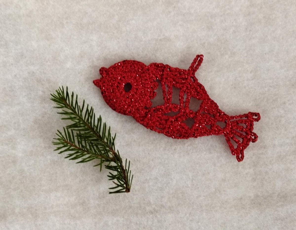 Rybka je uháčkovaná z vysoce kvalitní metalizované červené efektní příze německé výroby. Je pečlivě naškrobená, aby krásně držela tvar. Velikost rybky je 5cm x 10cm. Je ideální jako ozdoba na vánoční stromeček, věnec, záclonu nebo jako originální přízdoba k dárkům. Také ji můžeme volně položit na vánoční stůl. Fantazii se meze nekladou.
