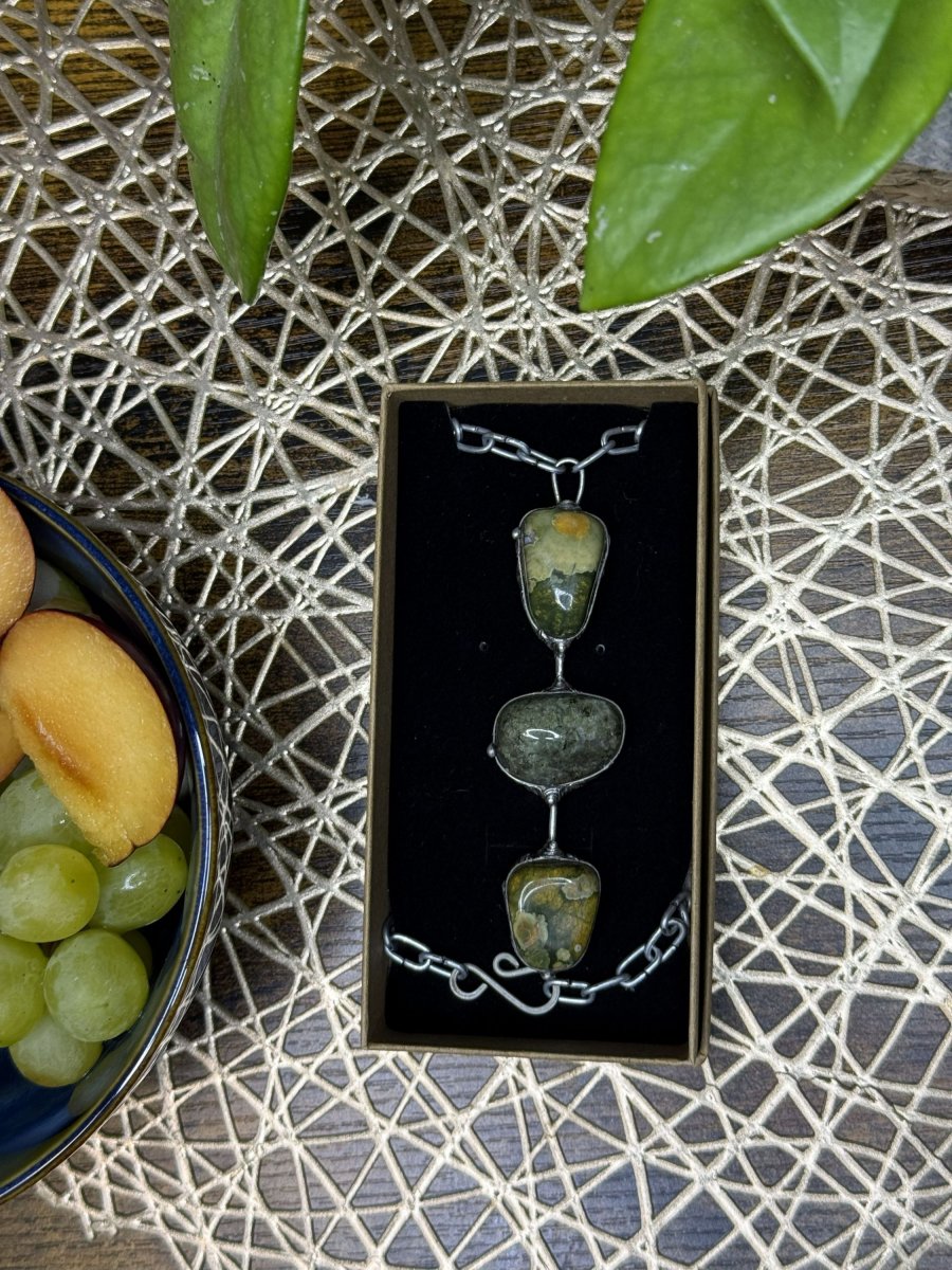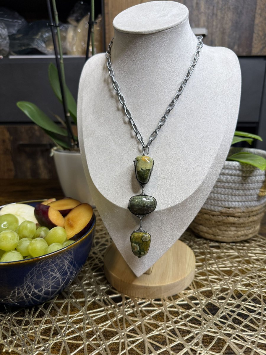 Náhrdelník z RYOLITU. Tři kameny spojené bezolovnatým cínem do výrazného šperku s krásnou kresbou. Černá patina obroušena do starostříbrné barvy. Vše ošetřeno antioxidačním olejem a vyleštěno karnaubským voskem.