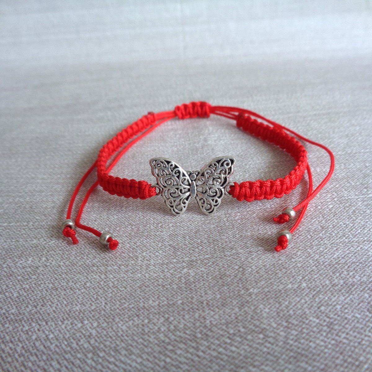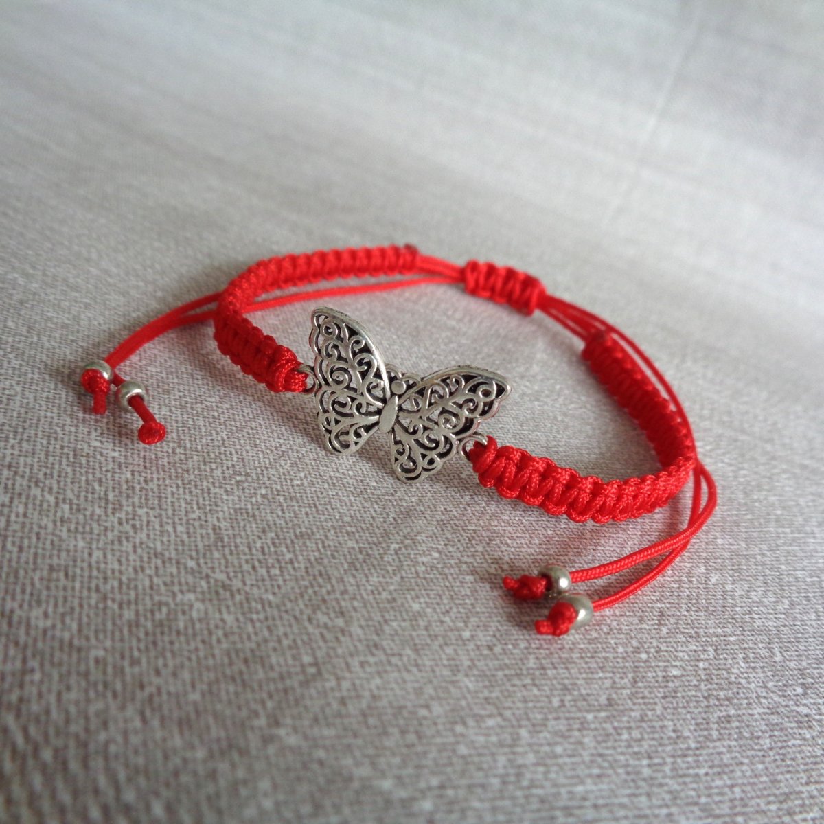 Velmi jemný, elegantní shamballa náramek z červené nylonové šňůrky a středového komponentu - motýlkem.