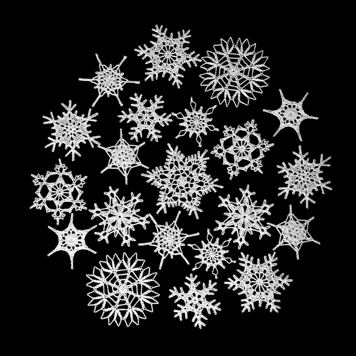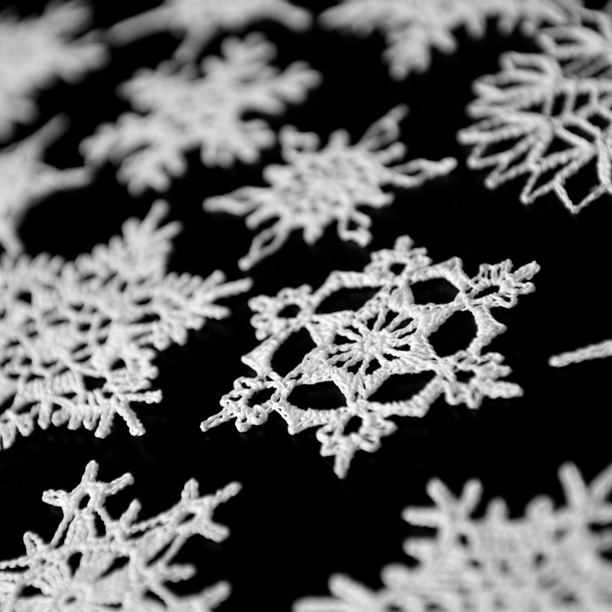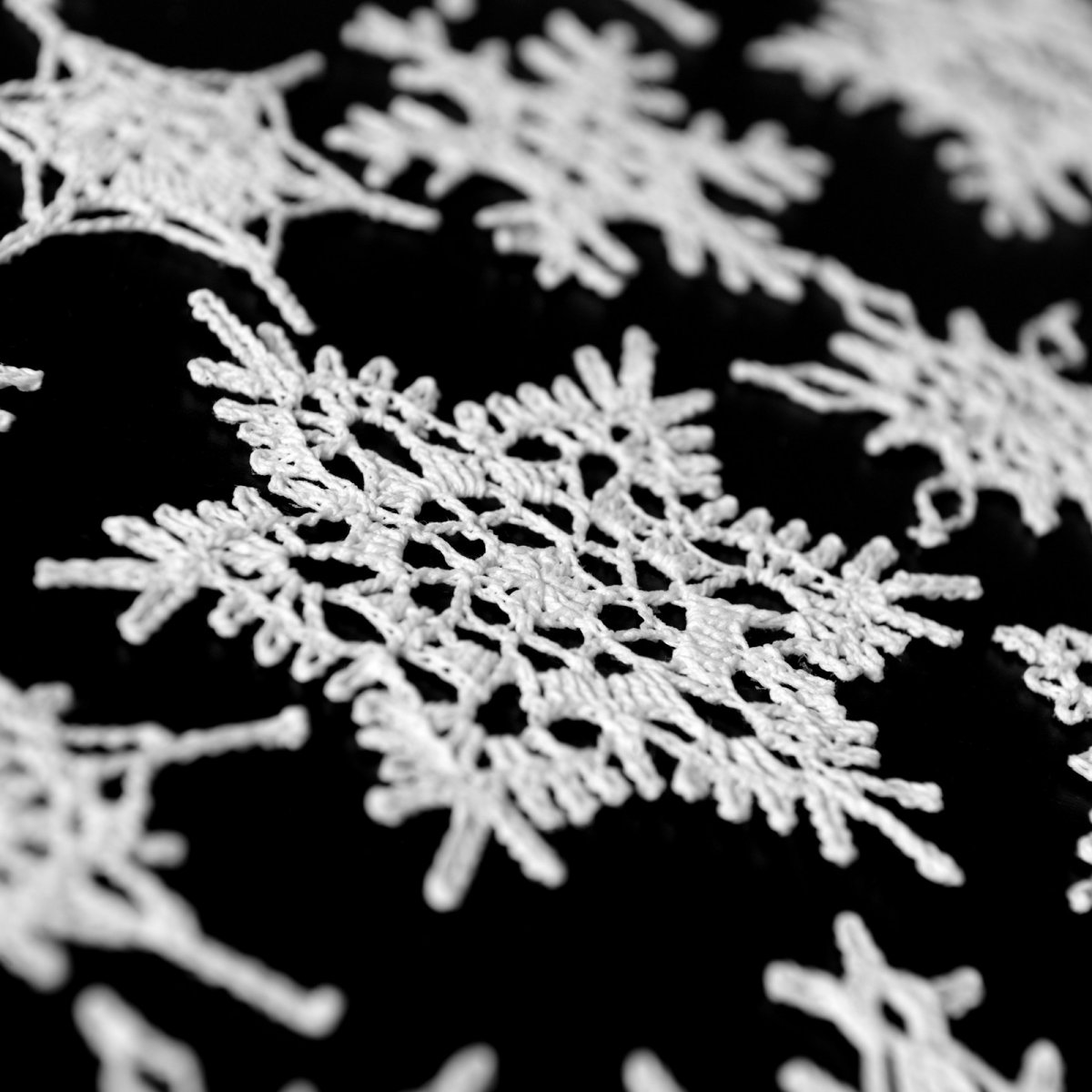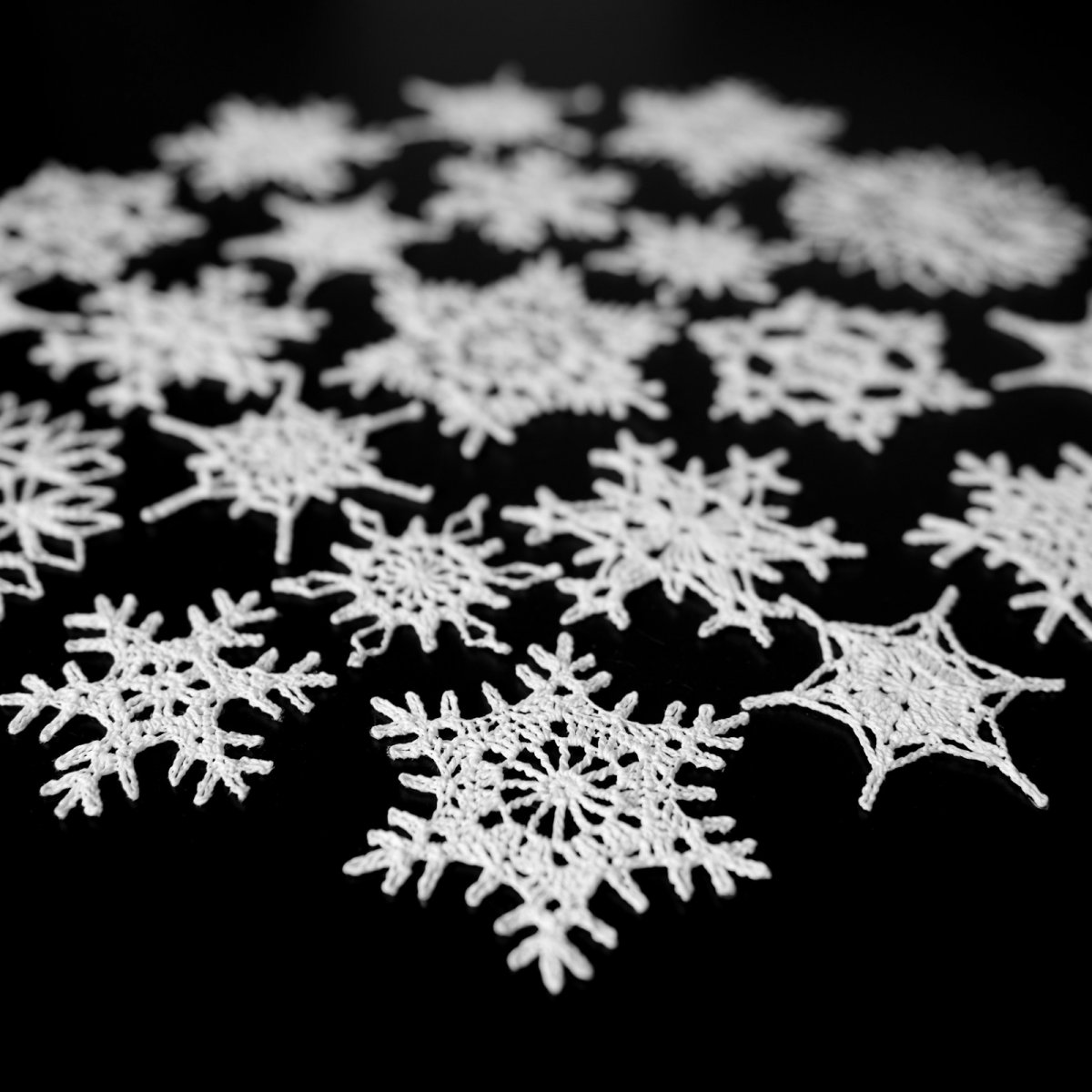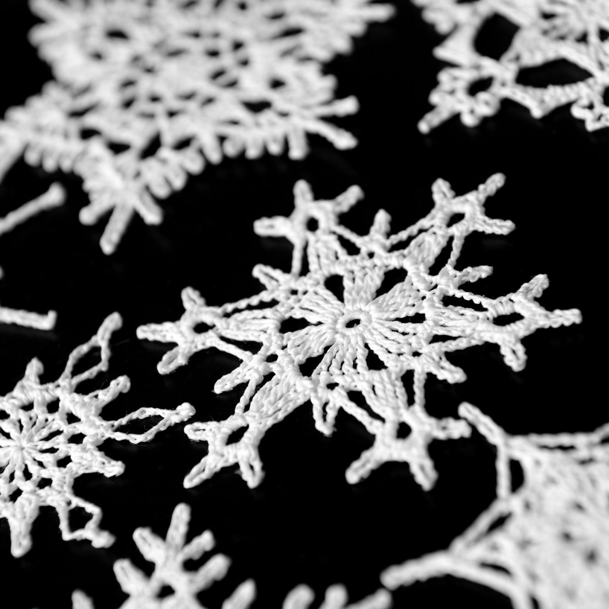 Háčkované sněhové vločky z bavlněné příze o průměru od 6 cm do 9 cm.