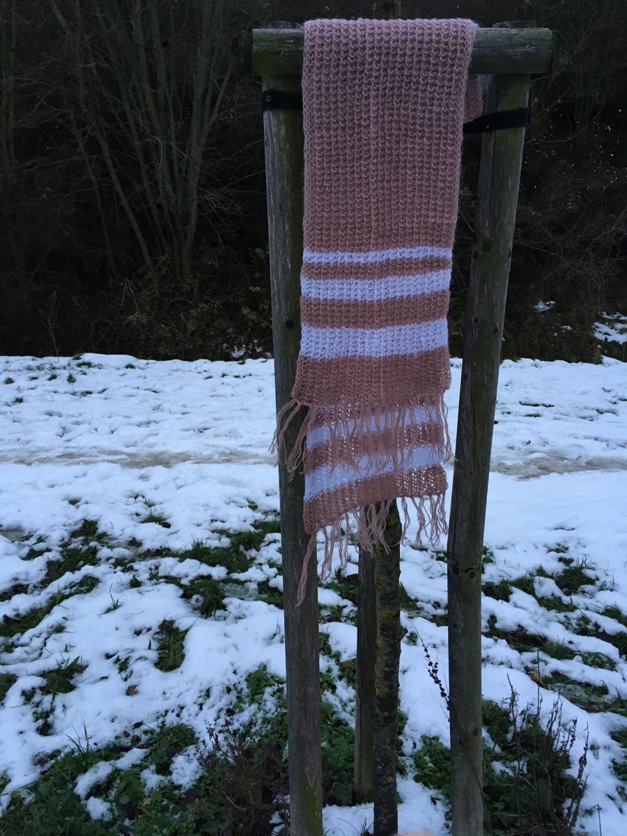 Z luxusní směsové příze kašmír/angora je upletená romantická šála v barvě bílé kávy (nebo slabého kakaa) s bílými pruhy.