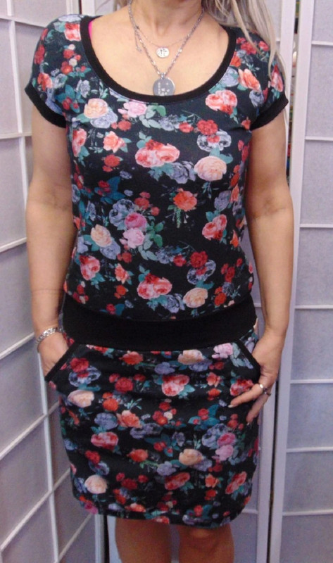 Střih mírně projmutý, kulatý výstřih, přinechané rukávky, sukně do lemu, na sukni všité 2 kapsy.