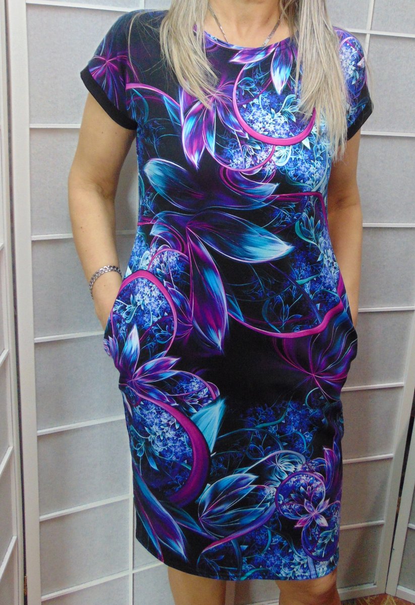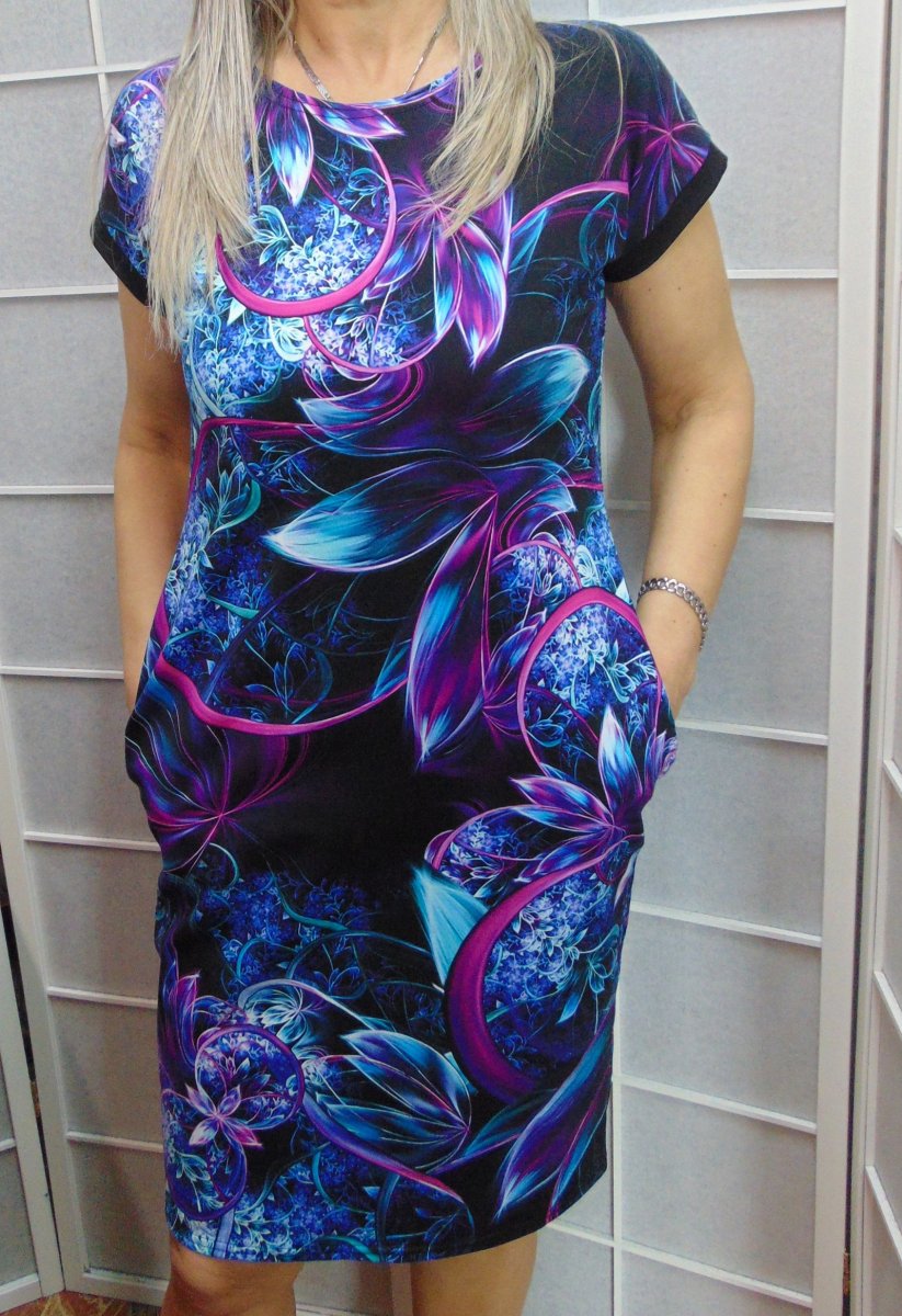 Šaty s kapsami - modrofialová abstrakce, velikost S ~ SLEVA ~