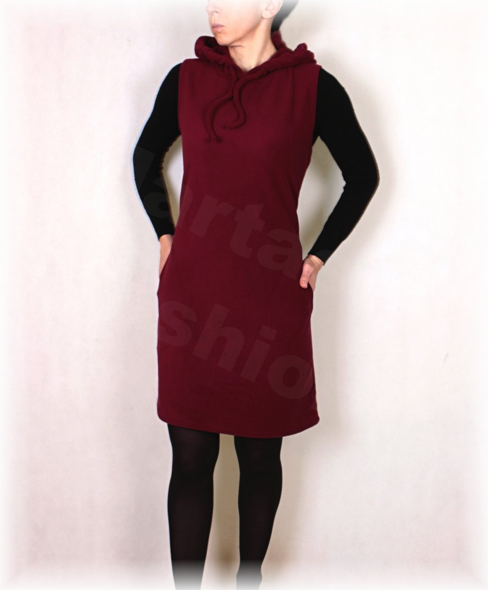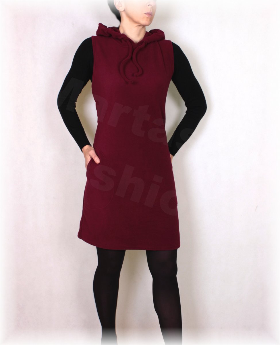 Šatovka polopřiléhavého střihu mírně do A z fleece, pohodlný střih s bočními kapsami(šaty mohou být i hladké bez kapes,jen s kapucí)Šatovku jde nosit i k legínám nebo úzkým riflím.Délka na přání.