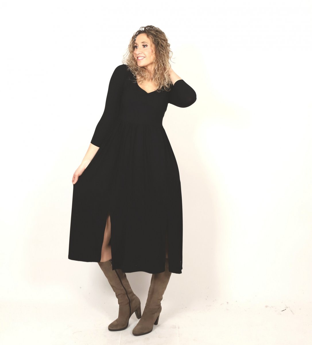 Šaty jsou ušité z úpletu viskóza/elastan. Mají dlouhou rozevlátou sukni a dva rozparky. Výstřih do tvaru srdce. V horní části jsou přiléhavé a pod prsy se rozvoňují do široké sukně sukně s nepravidelnou délkou.