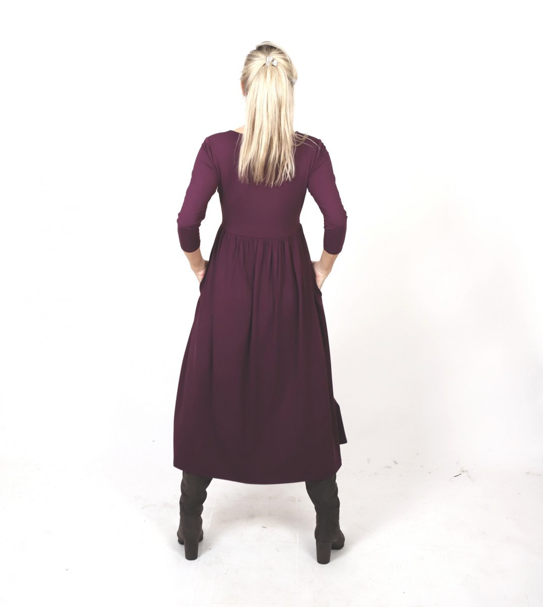 Šaty jsou ušité z úpletu viskóza/elastan. Mají dlouhou rozevlátou sukni a dva rozparky. Výstřih do tvaru srdce. V horní části jsou přiléhavé a pod prsy se rozvoňují do široké sukně sukně s nepravidelnou délkou.
