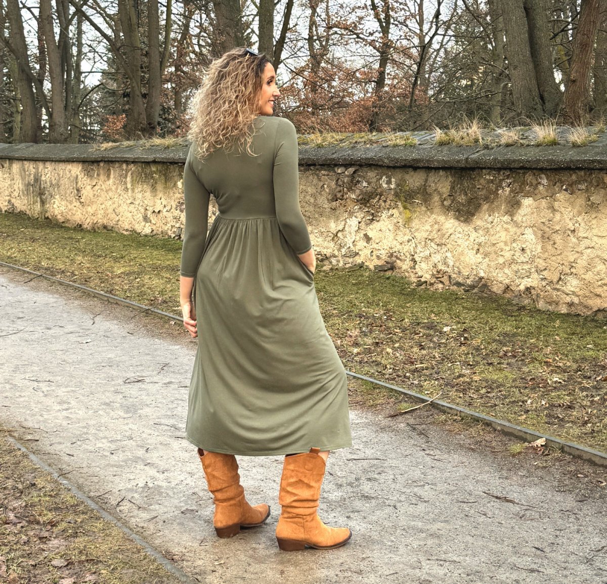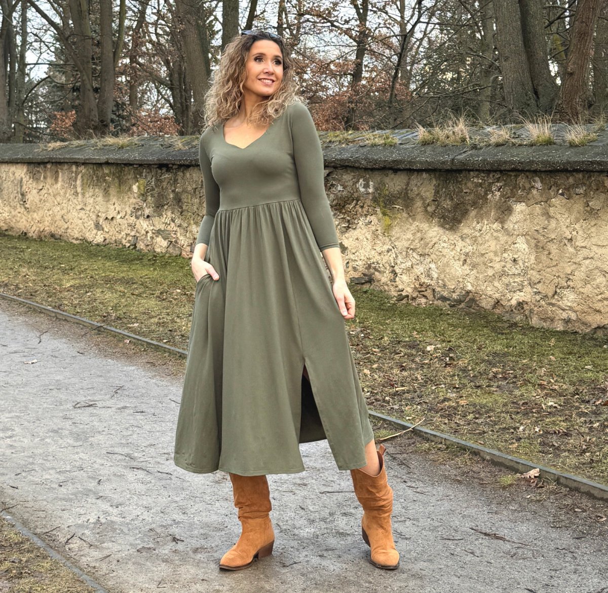 Šaty jsou ušité z úpletu viskóza/elastan. Mají dlouhou rozevlátou sukni a dva rozparky. Výstřih do tvaru srdce. V horní části jsou přiléhavé a pod prsy se rozvoňují do široké sukně sukně s nepravidelnou délkou.