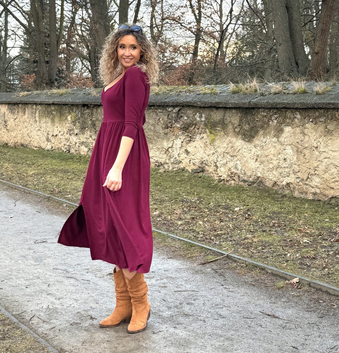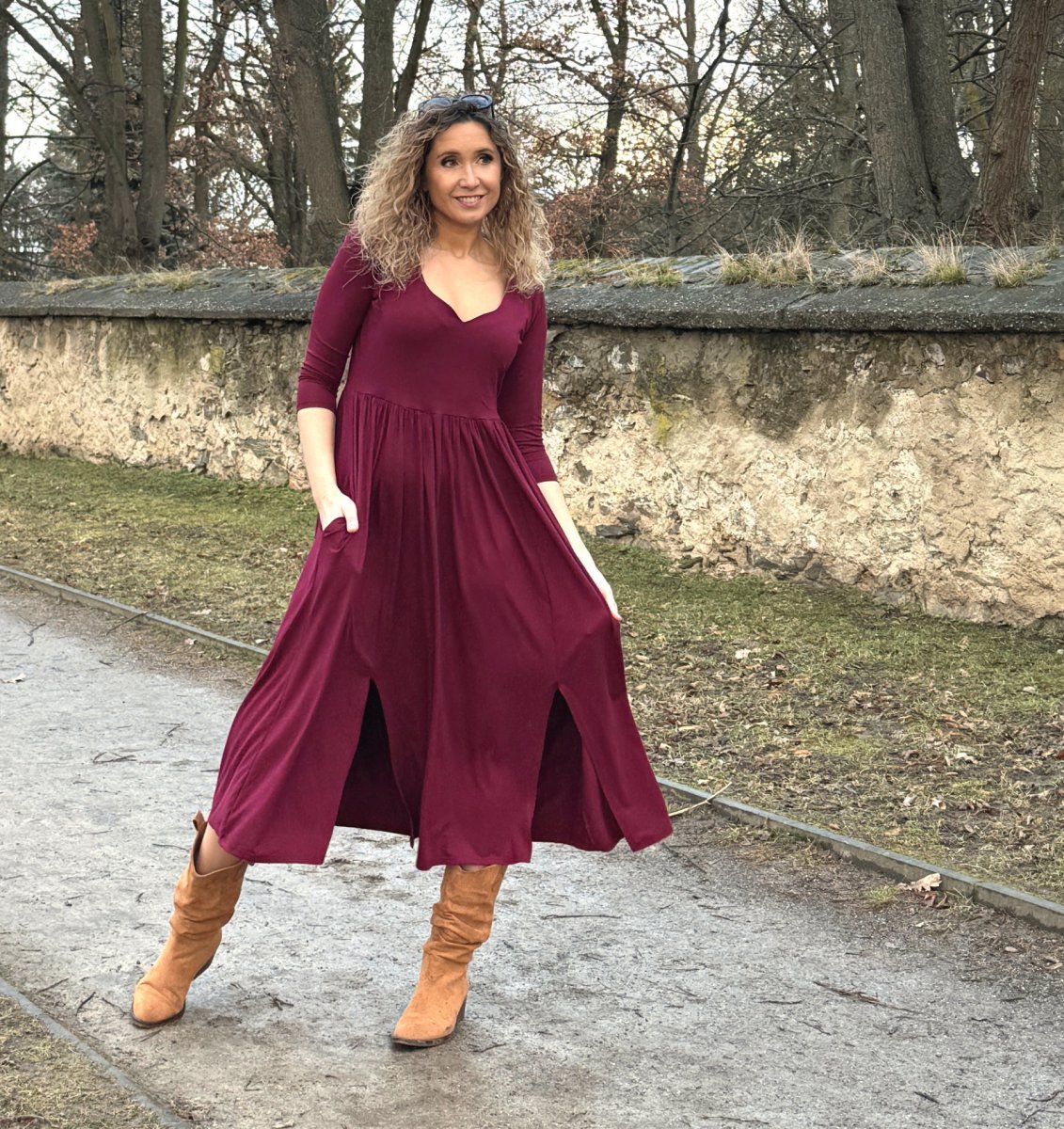 Šaty jsou ušité z úpletu viskóza/elastan. Mají dlouhou rozevlátou sukni a dva rozparky. Výstřih do tvaru srdce. V horní části jsou přiléhavé a pod prsy se rozvoňují do široké sukně sukně s nepravidelnou délkou.