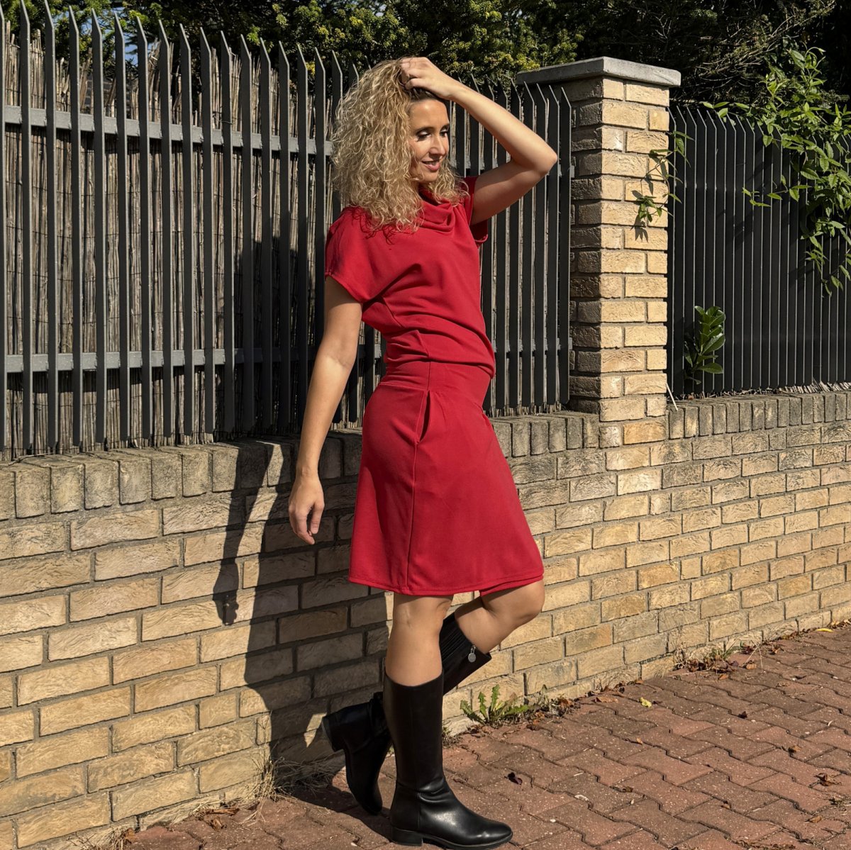Šaty mají navolněný roláček,Sukně je zavinutá a všitá do pružného pásku. V bočních švech jsou kapsy.