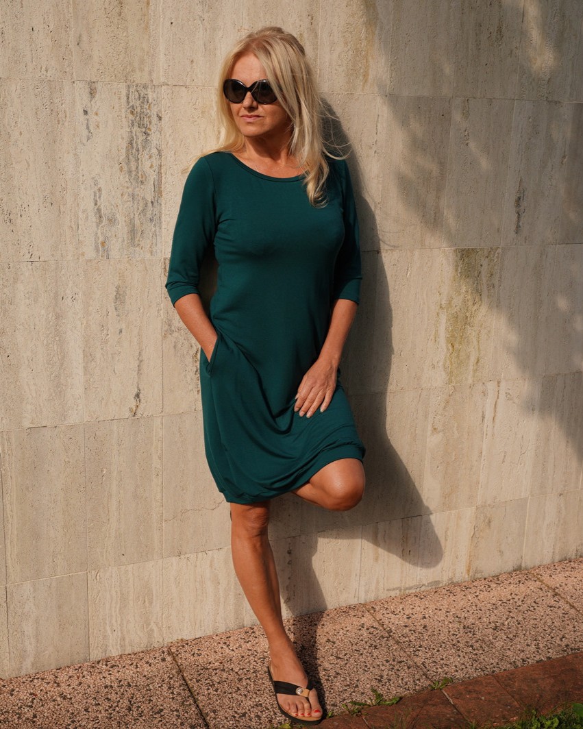 Ušité z tenčí splývavé elastické teplákoviny ve složení viscóza/polyester/lycra. Pohodlný projmutý střih, volnější na tělo.