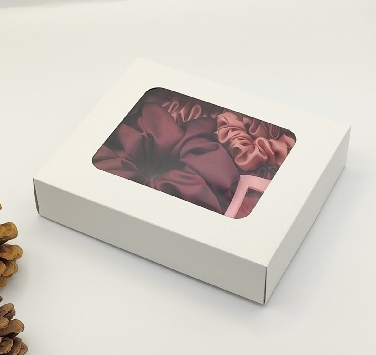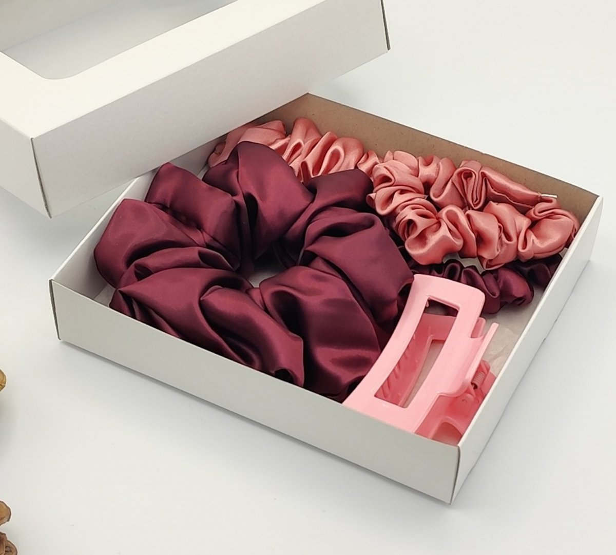 Dárková sada je nakombinovaná ve vínové a starorůžové barvě.