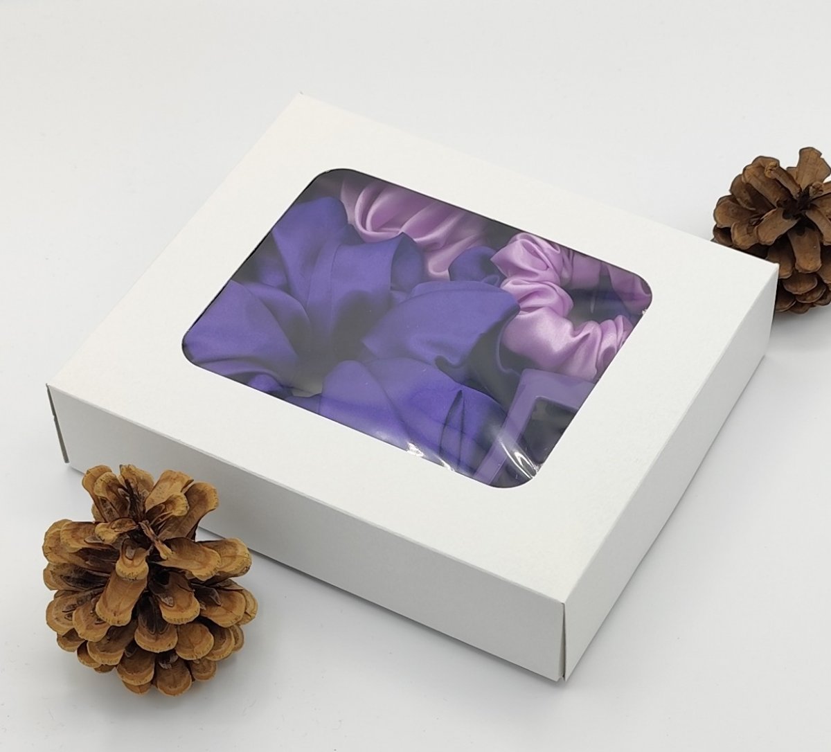 Dárková sada je nakombinovaná v tmavě fialové a fialově růžové barvě.