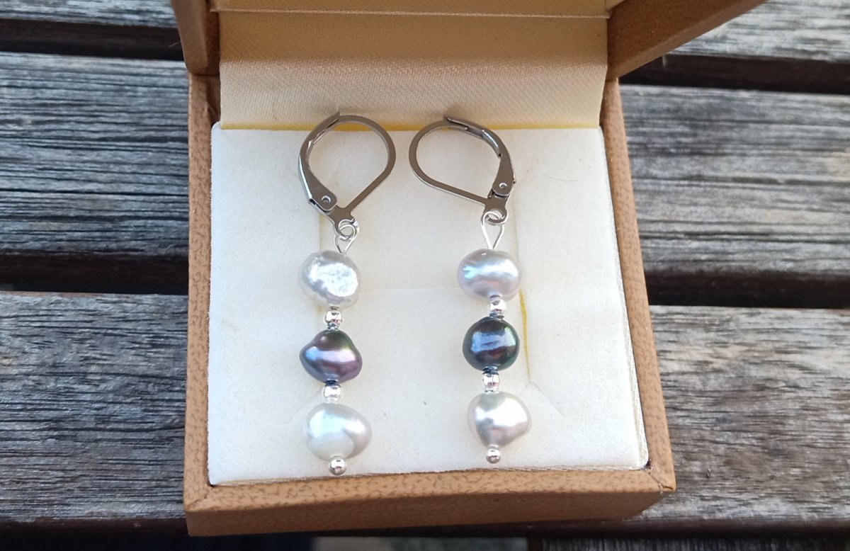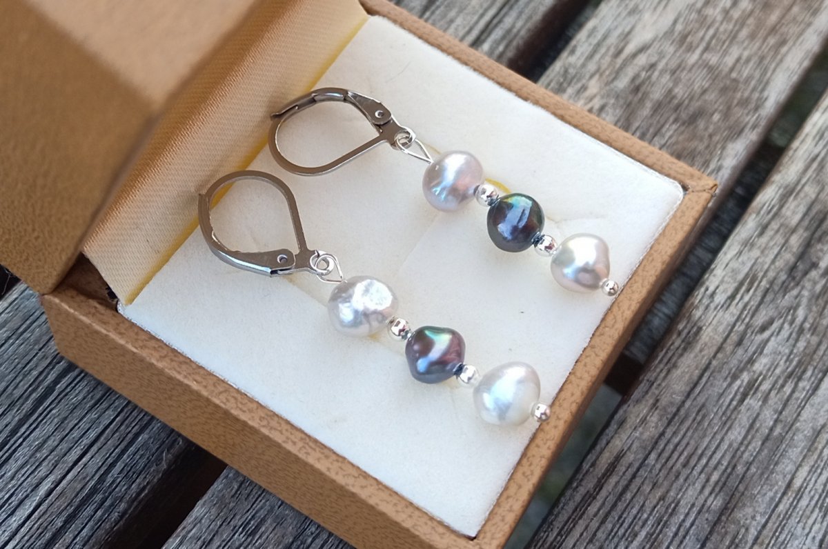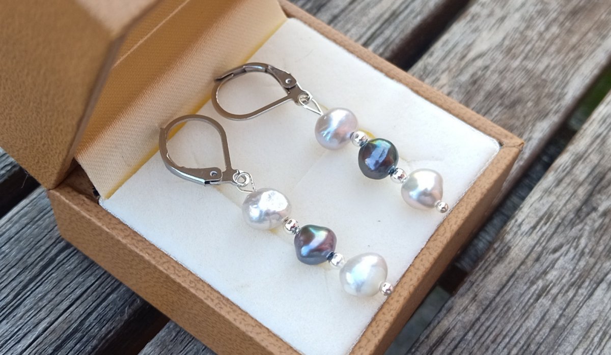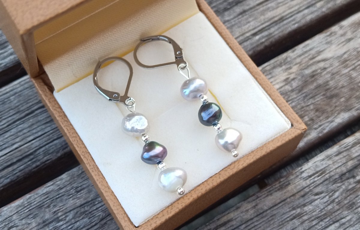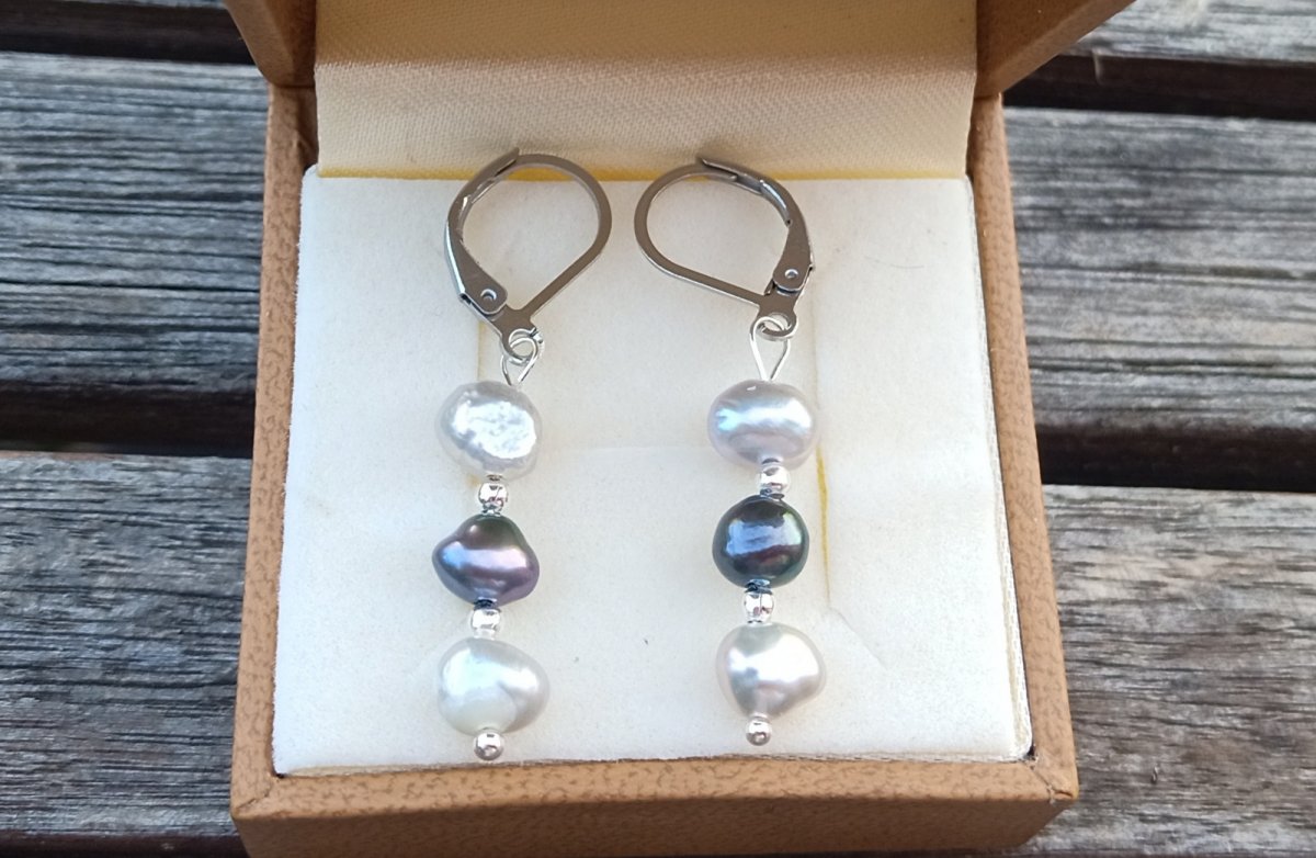 Dokonale lesklé říční perly velké cca 7 mm v přírodní světle a tmavě šedé barvě oddělené od sebe drobným stříbrným korálkem v elegantních náušnicích dlouhých 3,5 cm na zavíracích háčcích z chirurgické oceli - hypoalergenní, vhodné i pro alergiky.