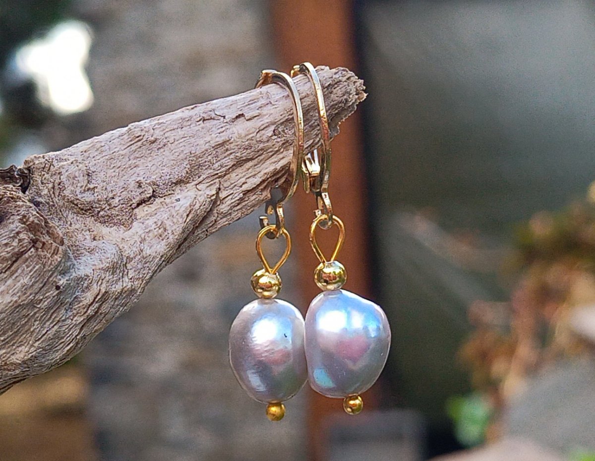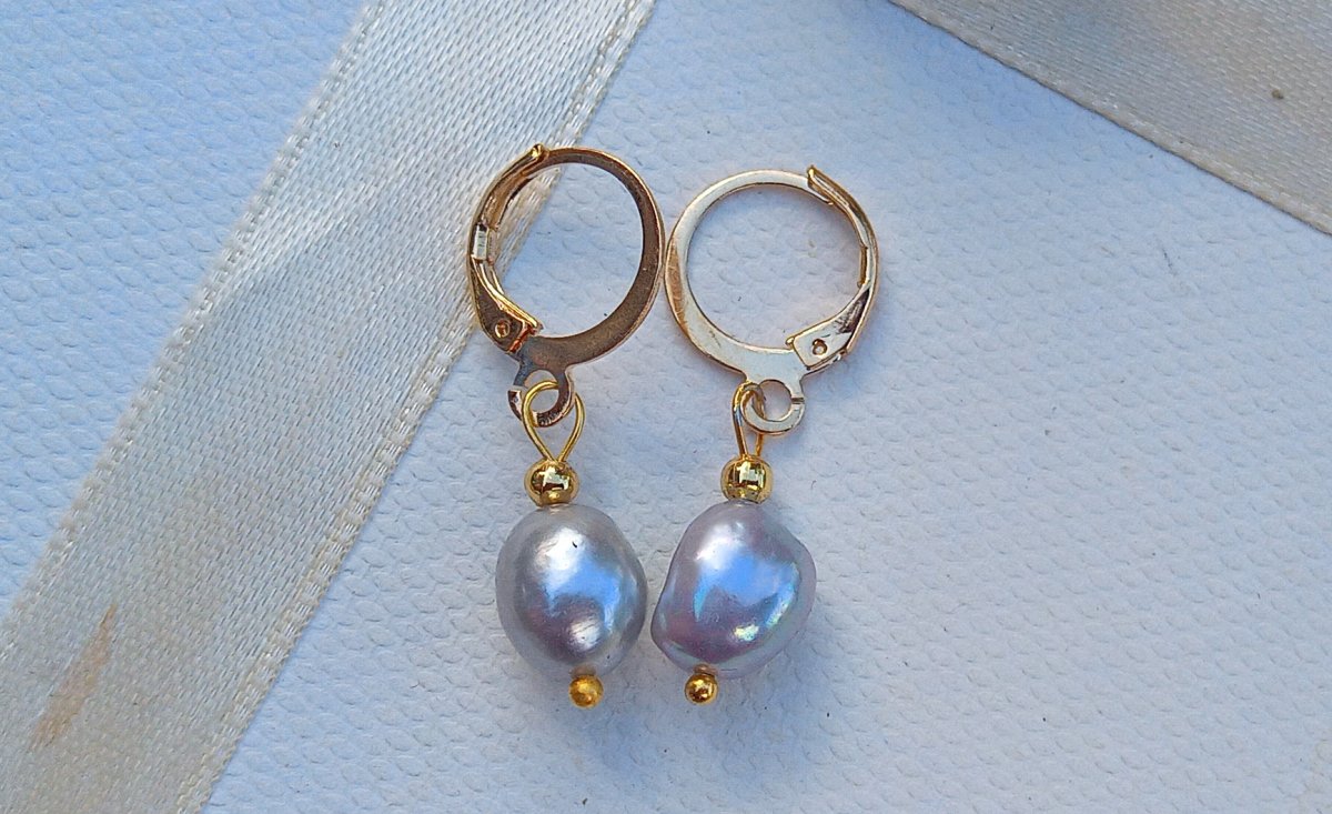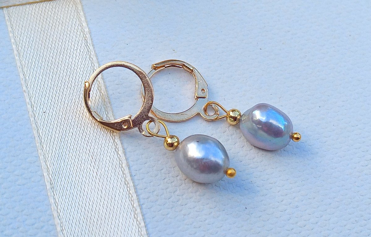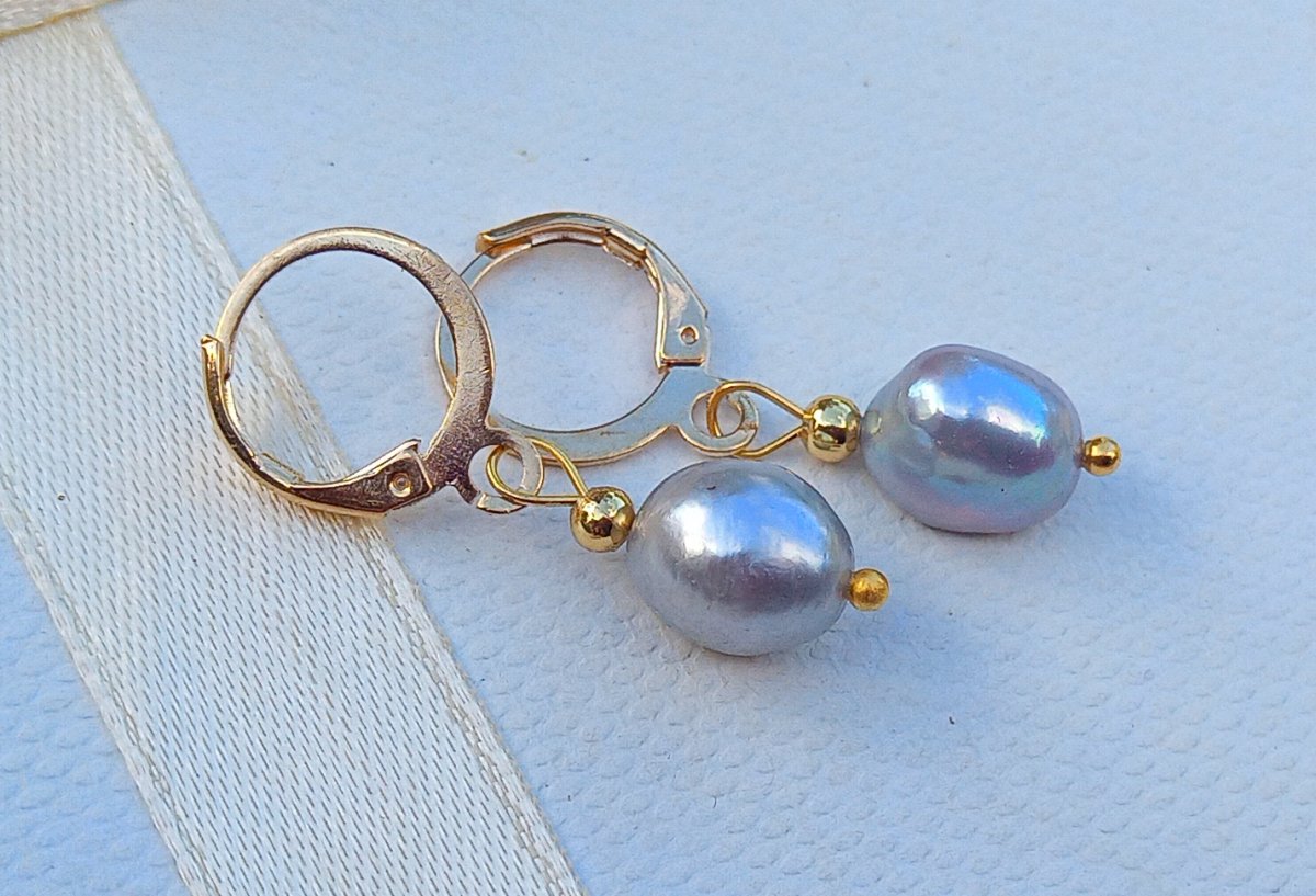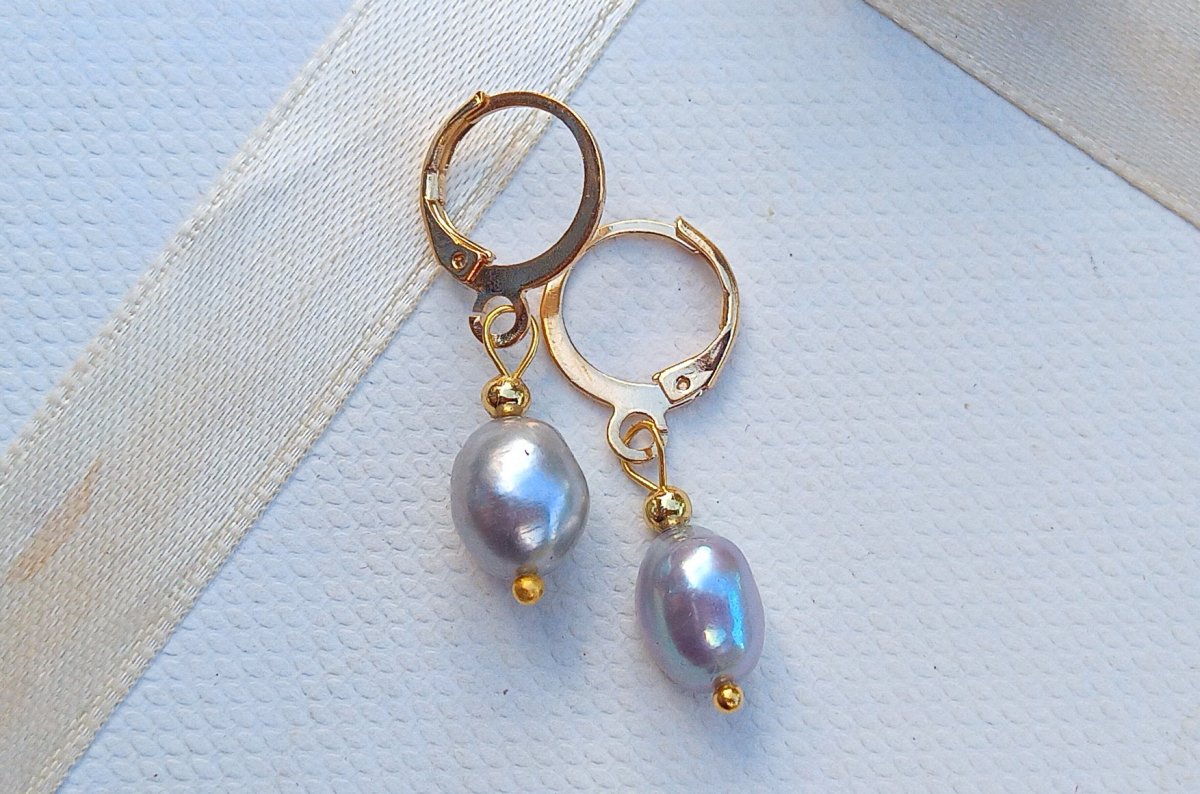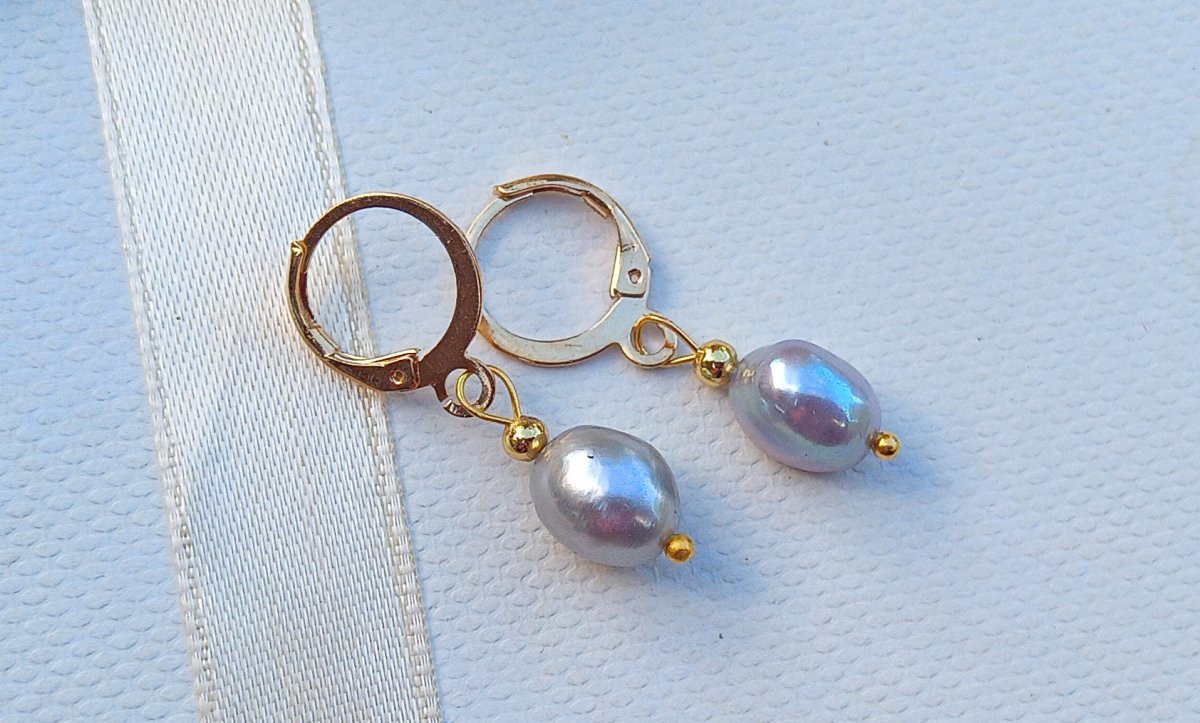 Dokonale lesklé šedé říční perly velké 10 mm v elegantních náušnicích dlouhých 3 cm na zavíracích háčcích z pozlacené chirurgické oceli - hypoalergenní, vhodné i pro alergiky.